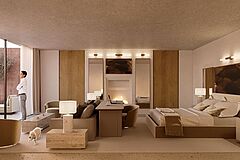 Das Hotel bietet neun elegant gestaltete Zimmer, die sich harmonisch in die weite Wüstenlandschaft einfügen. Innen sorgen hochwertige Textilien, großzügige Betten und ein behaglicher Wohnbereich in sanftem Licht für eine Atmosphäre purer Ruhe. Eine offene Terrasse mit Sitzgelegenheiten eröffnet den Blick auf die dahinterliegende Oase. Die stilvollen Badezimmer sind mit allen modernen Annehmlichkeiten ausgestattet. Für Familien oder Gruppen steht zudem eine großzügige Villa mit zwei Schlafzimmern bereit.