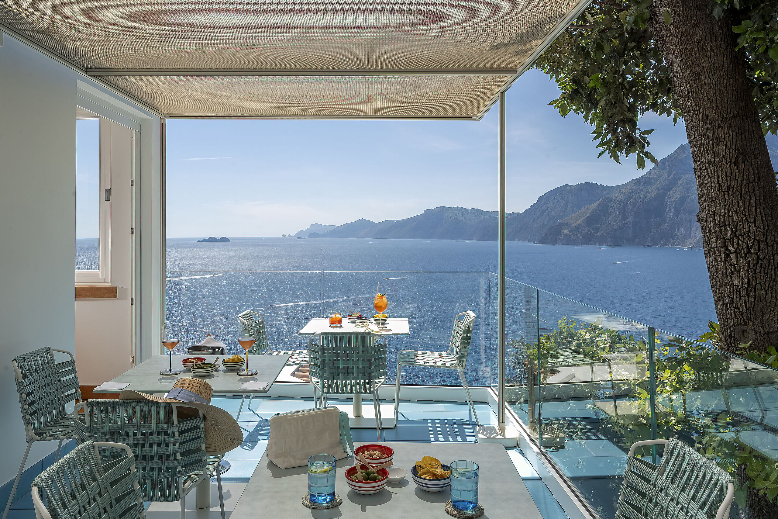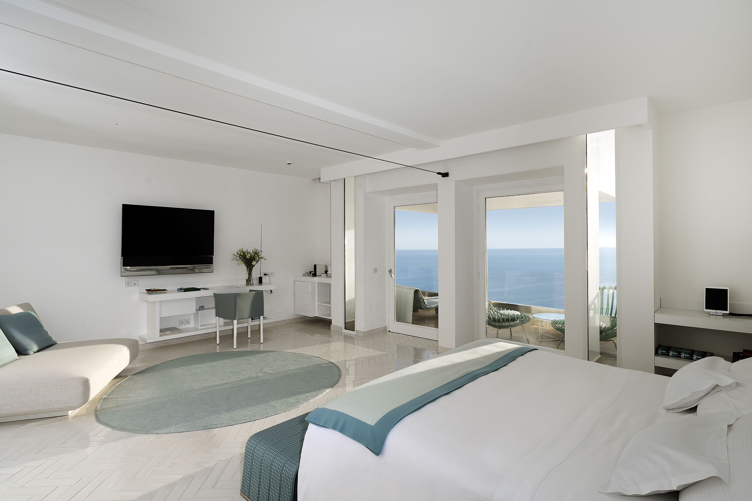 Lichtdurchflutet, luftig und von müheloser Eleganz geprägt, besticht die Suite mit ausgewählten Möbeln und Details. Die private 30 qm große Terrasse eröffnet einen spektakulären Blick auf die Amalfiküste.
