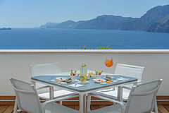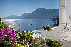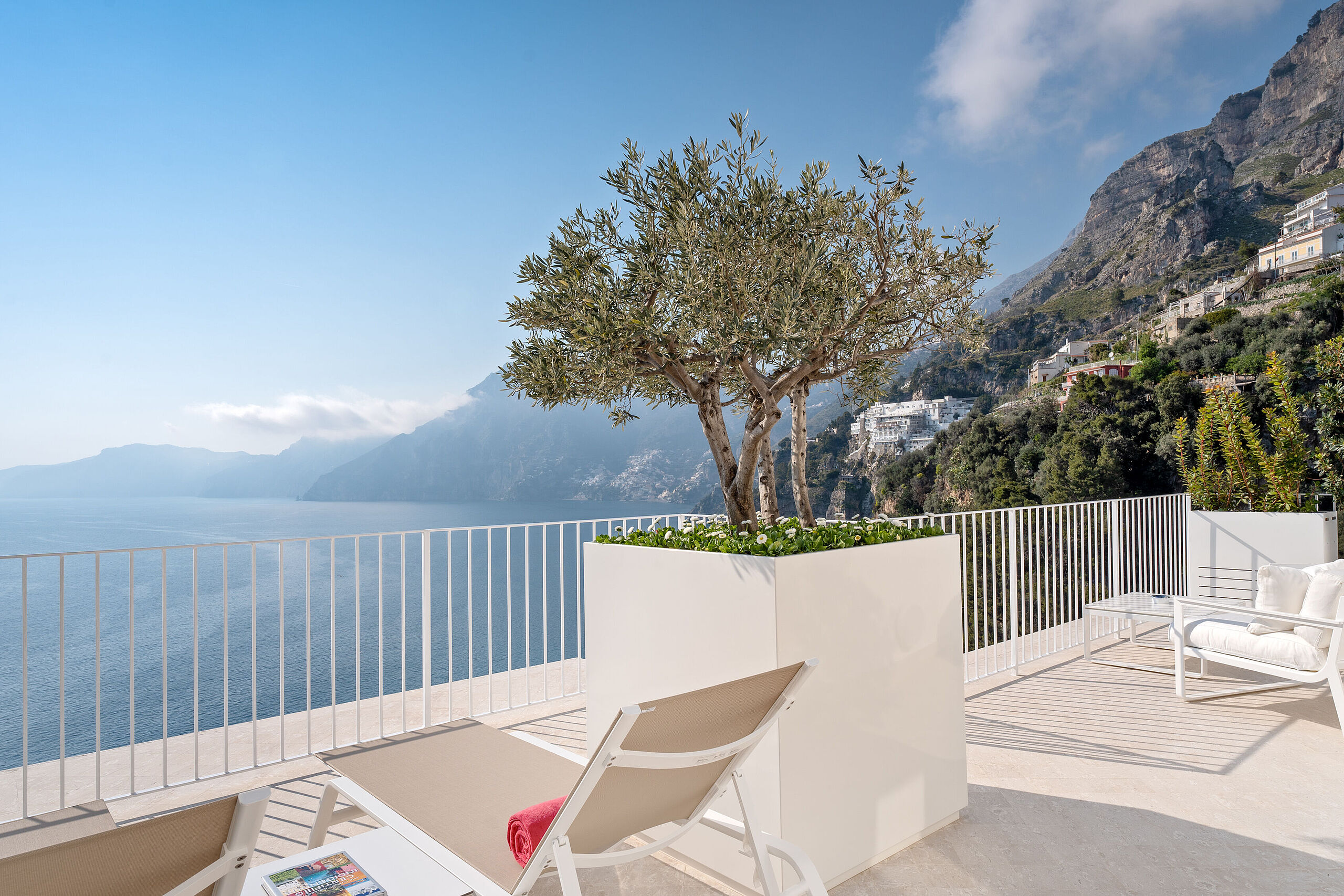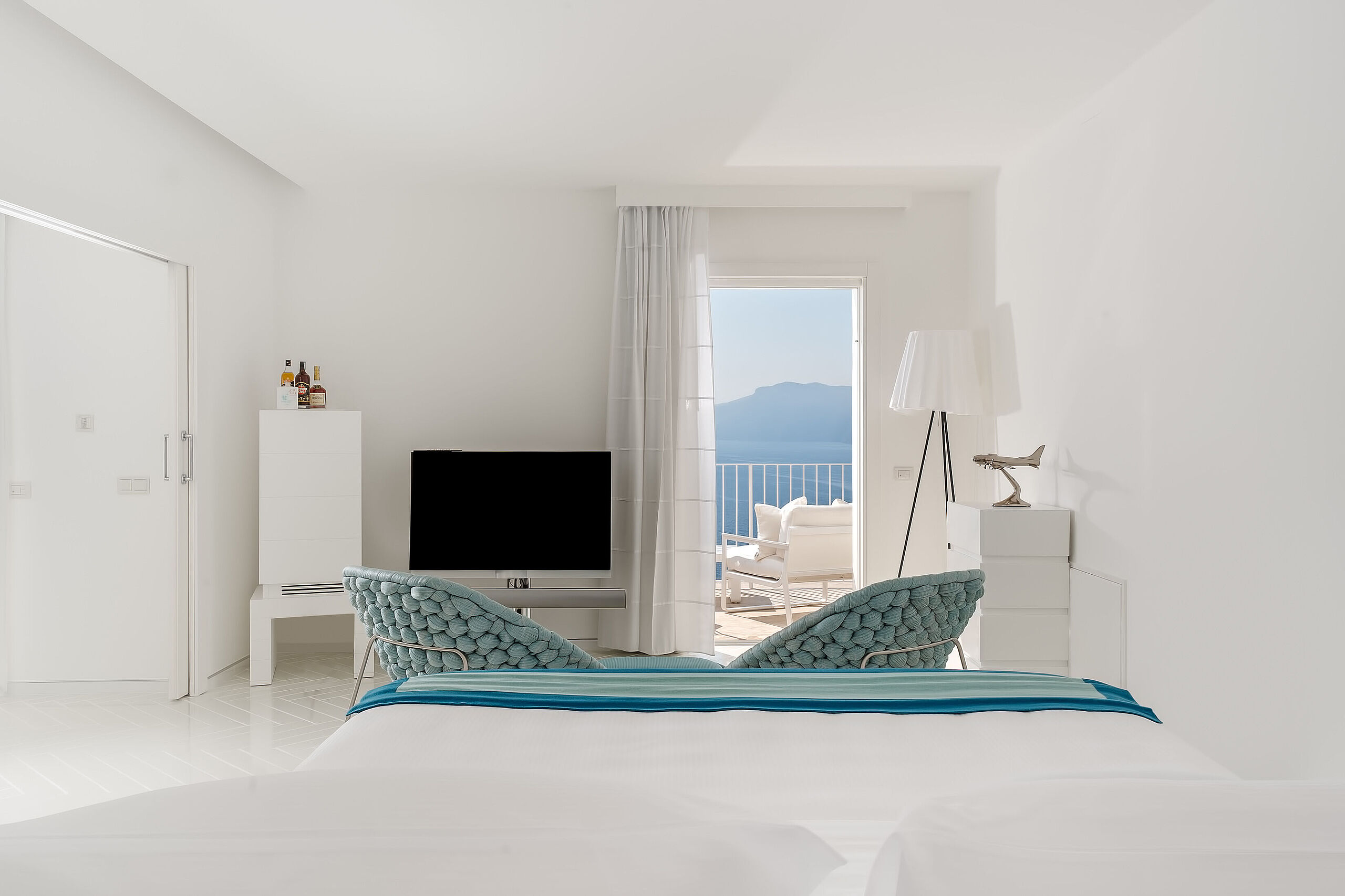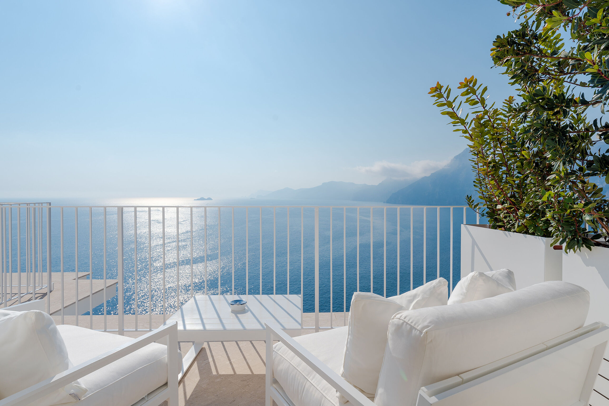 Eine Oase für höchste Ansprüche, gestaltet in beruhigenden Blau- und Weißnuancen. Besonders beeindruckend ist die weitläufige Terrasse, die den Blick über Positano bis hin nach Capri schweifen lässt.