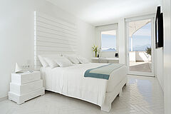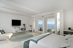 Die Angelina Suite im obersten Stockwerk vereint stilvolle Zurückhaltung mit einem spektakulären Panoramablick. In strahlendem Weiß gestaltet, bildet sie einen eleganten Kontrast zur farbenprächtigen Küstenlandschaft. Eine 30 qm große private Terrasse lädt dazu ein, Sonne und Ausblick in vollkommener Privatsphäre zu genießen.