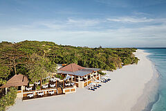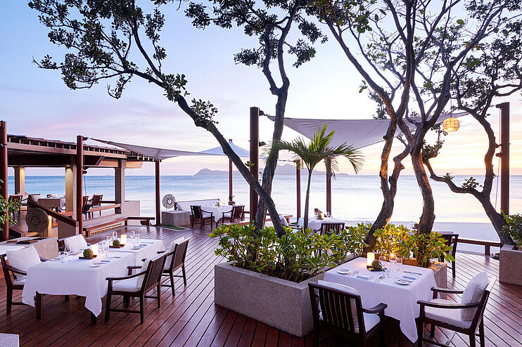 Kulinarisch verwöhnt das Resort mit Restaurants wie The Clubhouse, Beach Club und Lagoon Club, ergänzt durch besondere Erlebnisse wie private Grillabende oder Picknicks auf Sandbänken.