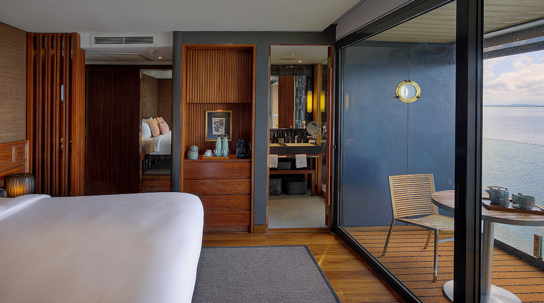 Die Owner’s Suite präsentiert sich als außergewöhnlich großzügige Wohnresidenz mit separatem Wohn- und Schlafbereich sowie privatem Balkon. Bodentiefe Fenster, edle Materialien und klare Linien eröffnen eindrucksvolle Ausblicke auf die vorbeiziehende Flusslandschaft.