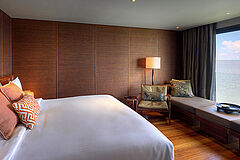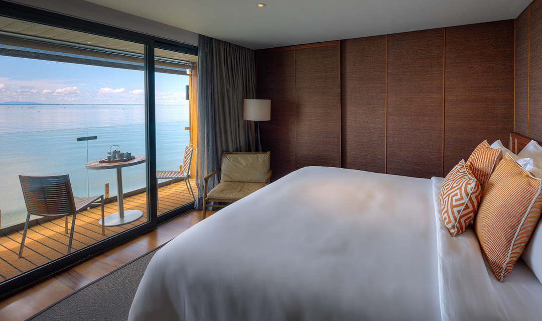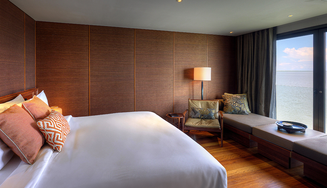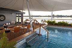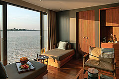 Die Panorama Suite überzeugt durch ein offenes Raumkonzept und weitläufige Fensterfronten mit direktem Blick auf den Mekong. Zeitgenössisches Design und hochwertige Ausstattung schaffen ein lichtdurchflutetes Refugium auf dem Wasser.