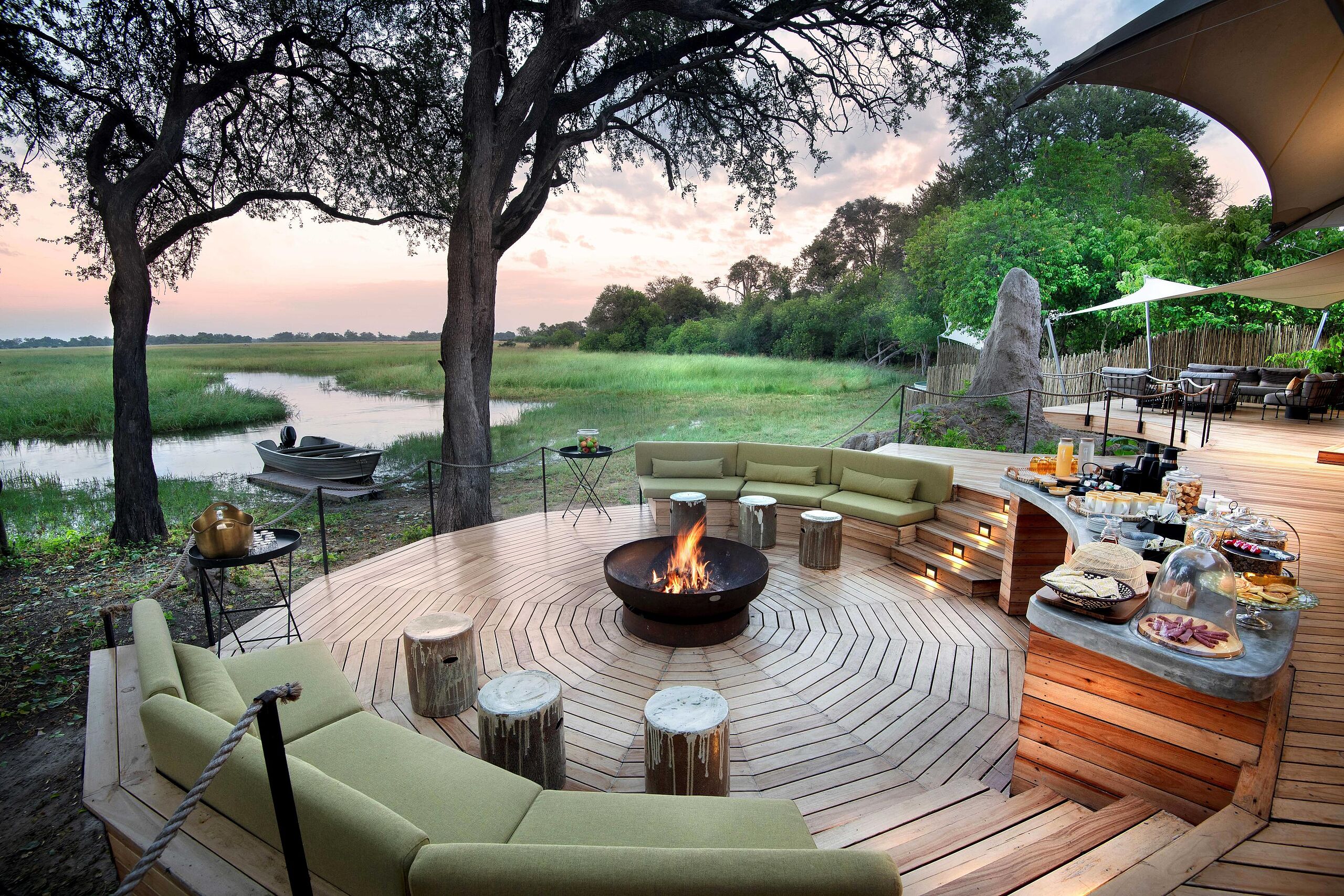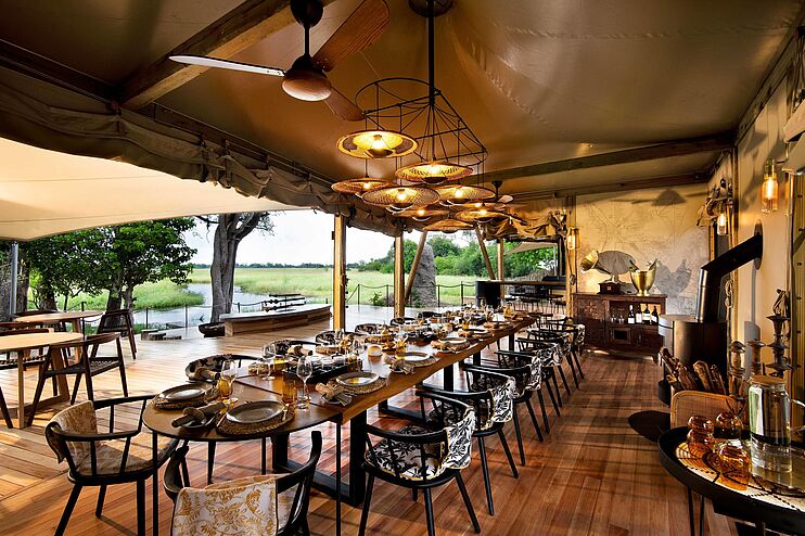 Das Camp wird ausschließlich als „Fully Inclusive“ angeboten: Alle Mahlzeiten, Snacks und Getränke – einschließlich ausgewählter alkoholischer Getränke – sind im Preis enthalten. Lediglich importierte Marken und Premiumspirituosen werden separat berechnet. Die meisten Mahlzeiten werden im stilvollen Hauptzelt angeboten, doch auf Wunsch lassen sich auch private Dinner arrangieren – sei es am Pool oder mitten im Busch, unter dem afrikanischen Sternenhimmel.