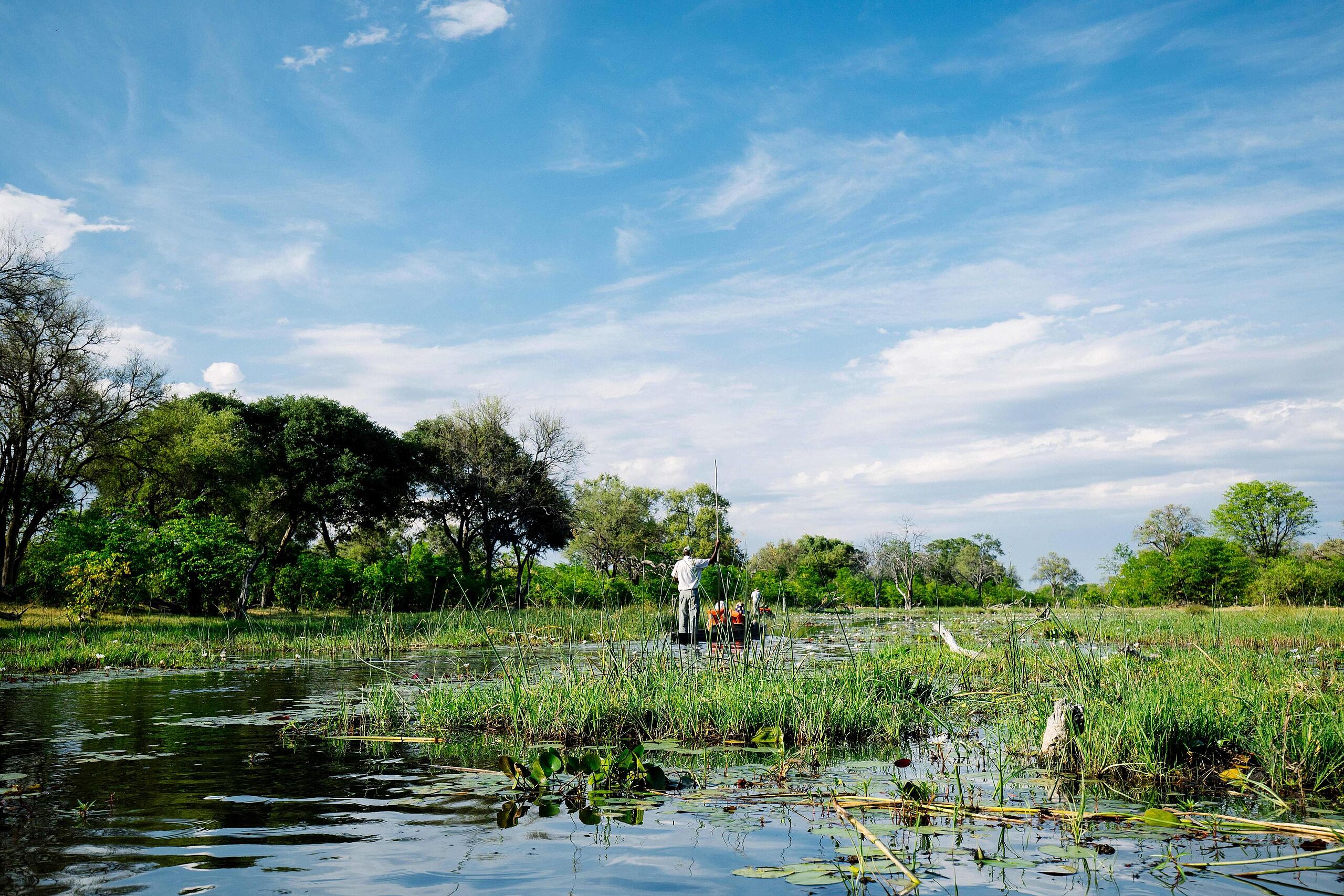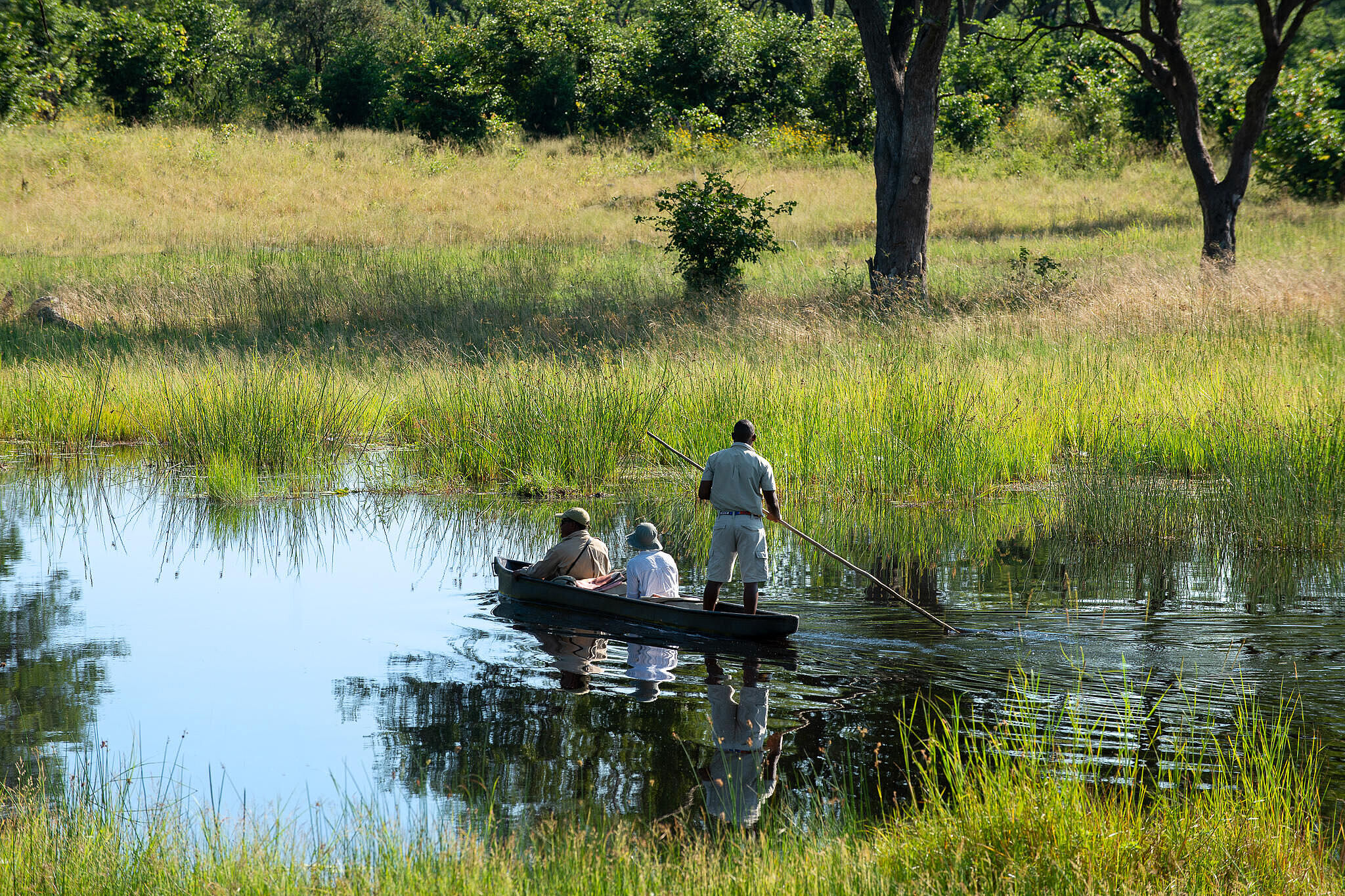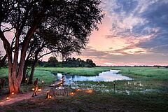 Die Tage beginnen mit Pirschfahrten im sanften Licht des Morgens, wenn die Savanne erwacht und die Tierwelt aktiv wird. Nach Einbruch der Dunkelheit zeigen Nachtfahrten eine andere, faszinierende Seite des Buschs. Auf geführten Wandersafaris erleben Gäste die Natur aus unmittelbarer Nähe. Saisonale Mokoro-Touren bieten die Möglichkeit, durch die Wasserwege des Deltas zu gleiten und die Flora und Fauna aus einer anderen Perspektive zu beobachten.