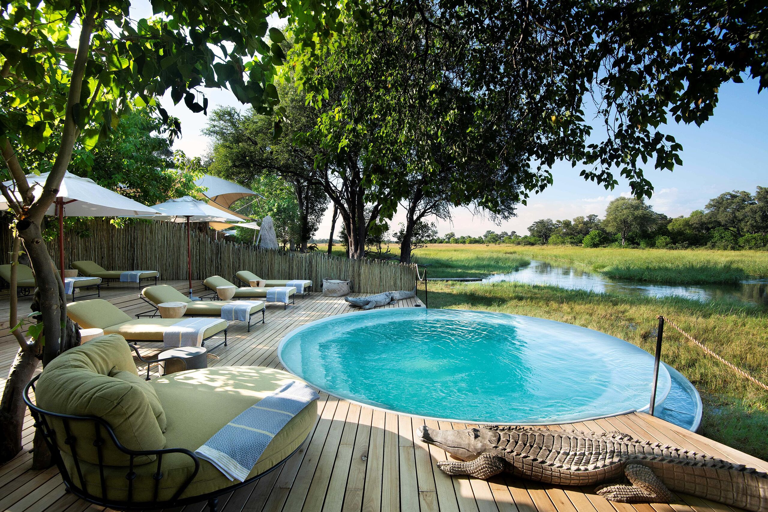 Der Pool im Camp ist eine Oase der Ruhe und Entspannung. Umgeben von einem schattenspendenden Deck mit bequemen Sonnenliegen und Sonnenschirmen, bietet er einen ungestörten Blick auf die weite Flusslandschaft. Hier können Gäste nach aufregenden Safari-Aktivitäten die Seele baumeln lassen.