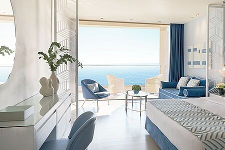 Die Ikos Oceania Junior Suite, elegant und geräumig mit fantastischem Meerblick von einem privaten Balkon. Die Junior Suiten im Ikos Oceania Hotel bieten einen kombinierten, offenen Schlaf- und Wohnbereich in dem bis zu 3 Personen bzw. 2 Erwachsene und 1 Kind beherbergt werden können.