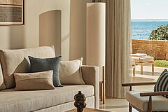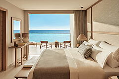 Die Panorama Junior Suite ist perfekt geschnitten: luftiges Design und ein offener Sitzbereich laden zum Entspannen ein. Highlight dieser Suite ist der gigantische Panoramablick auf die Ägäis.