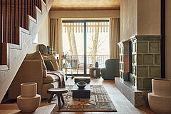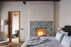Die zweistöckige Chiemsee Royal Suite vereint stilvolle Eleganz mit Luxus: zwei Balkone, ein Kamin mit handgefertigten Kacheln, private Sauna und großzügige Wohnfläche. Der Blick durch die Baumwipfel auf den Chiemsee ist spektakulär. Oben gibt es Platz für ein Kind oder einen weiteren Gast.