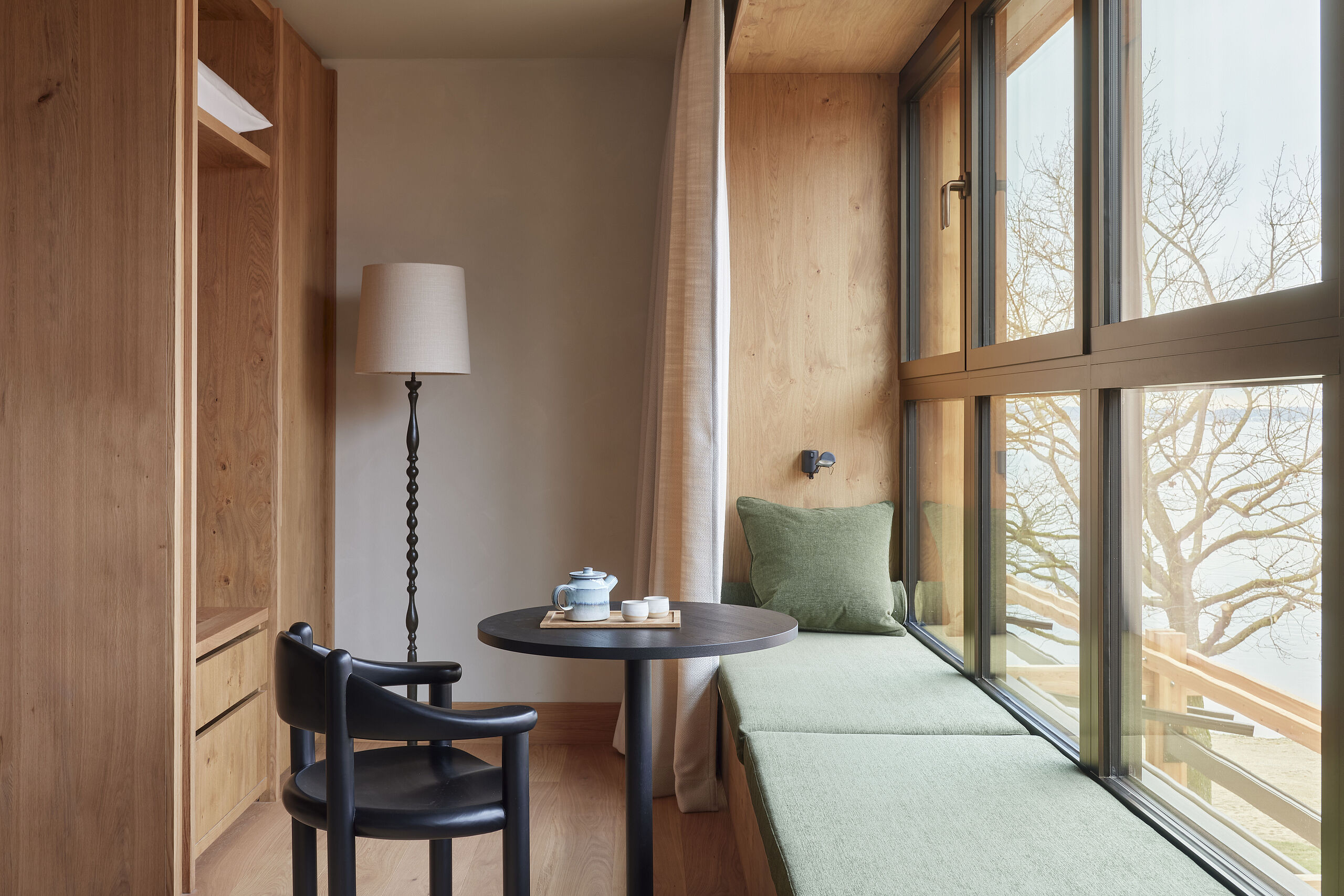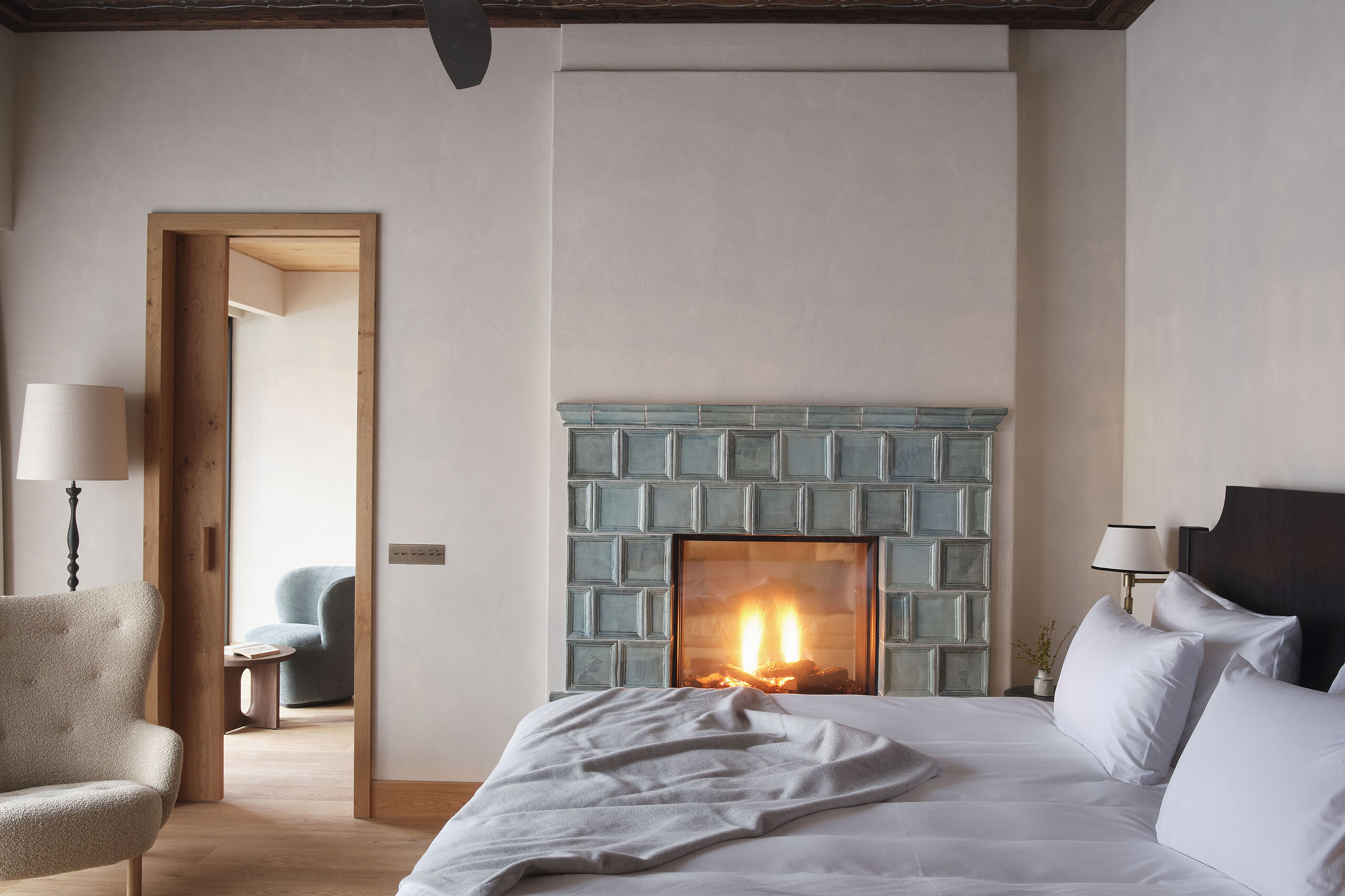 Die Corner Suite vereint ruhige Eleganz mit Panoramafenster und traumhaftem Chiemseeblick. Die Verbindung zur Chiemsee Suite macht sie ideal für Familien.