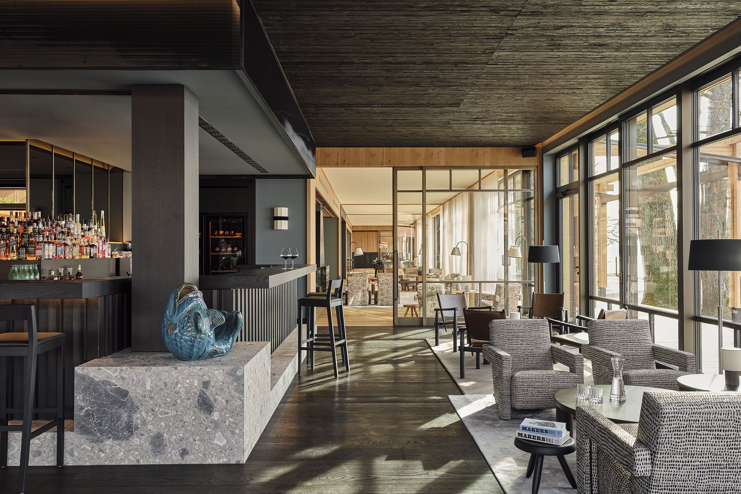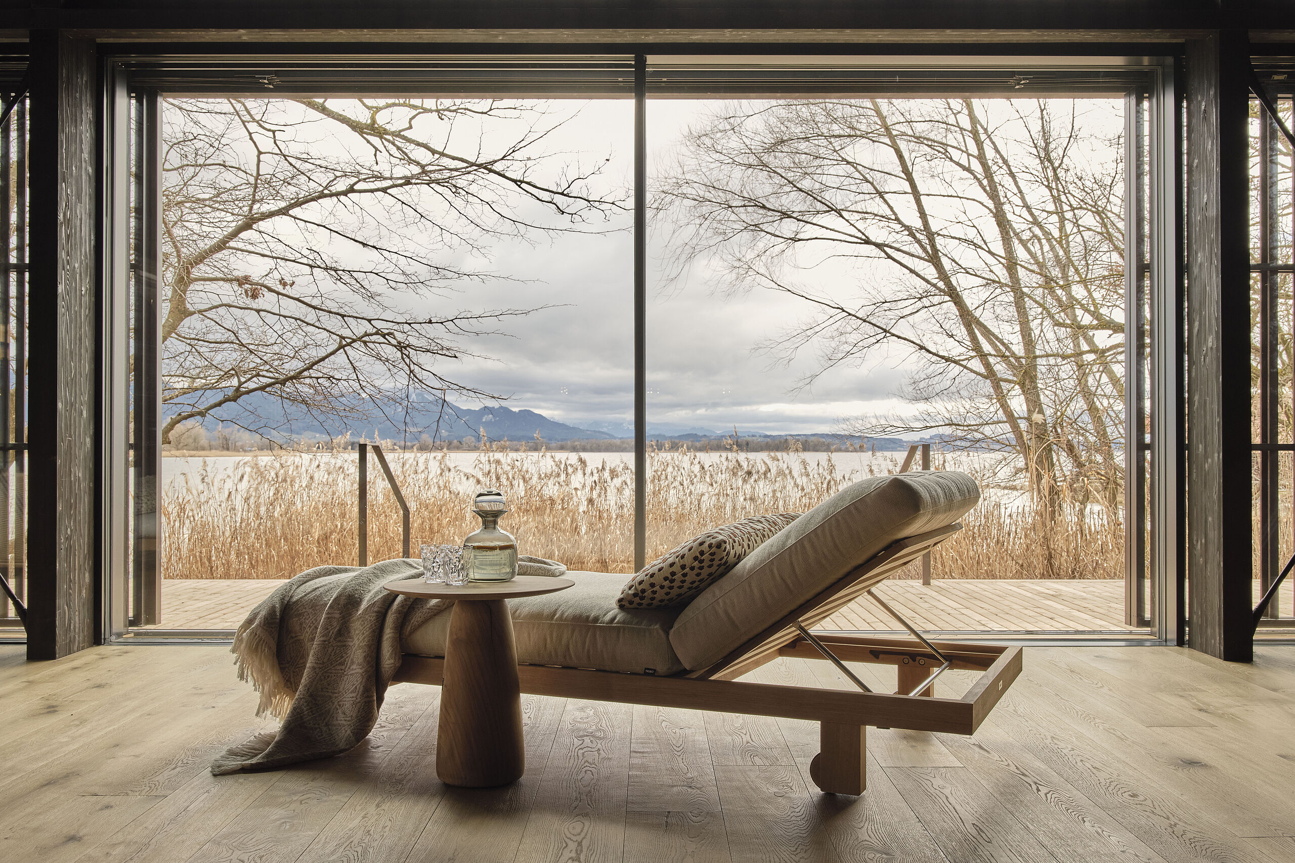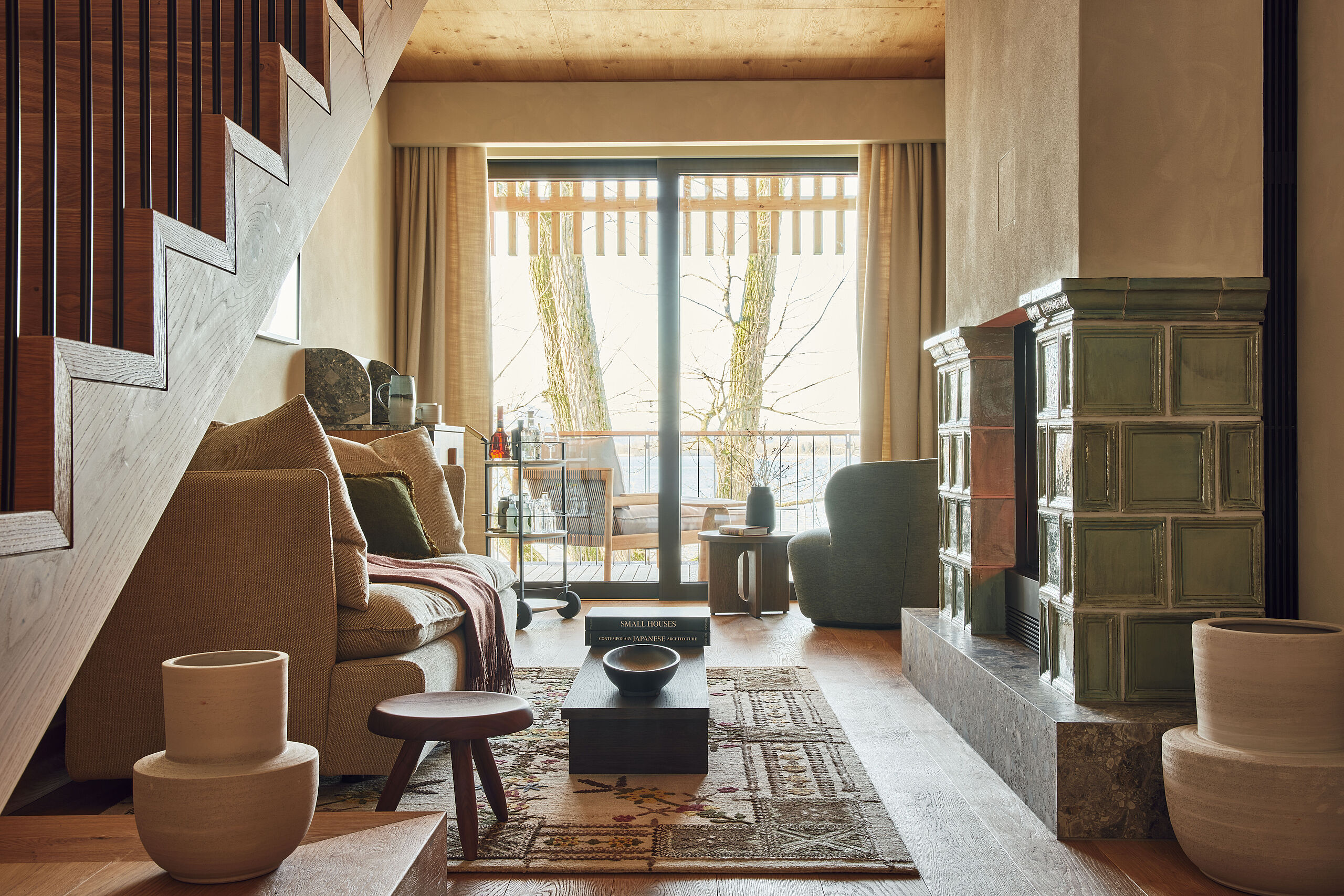 Ein besonderes Highlight dieser Suite ist die von Matteo Thun designte Ofuro-Badewanne aus Lärchenholz, handgefertigt in Italien. Direkt am Fenster platziert, eröffnet sie einen atemberaubenden Blick auf den Chiemsee.