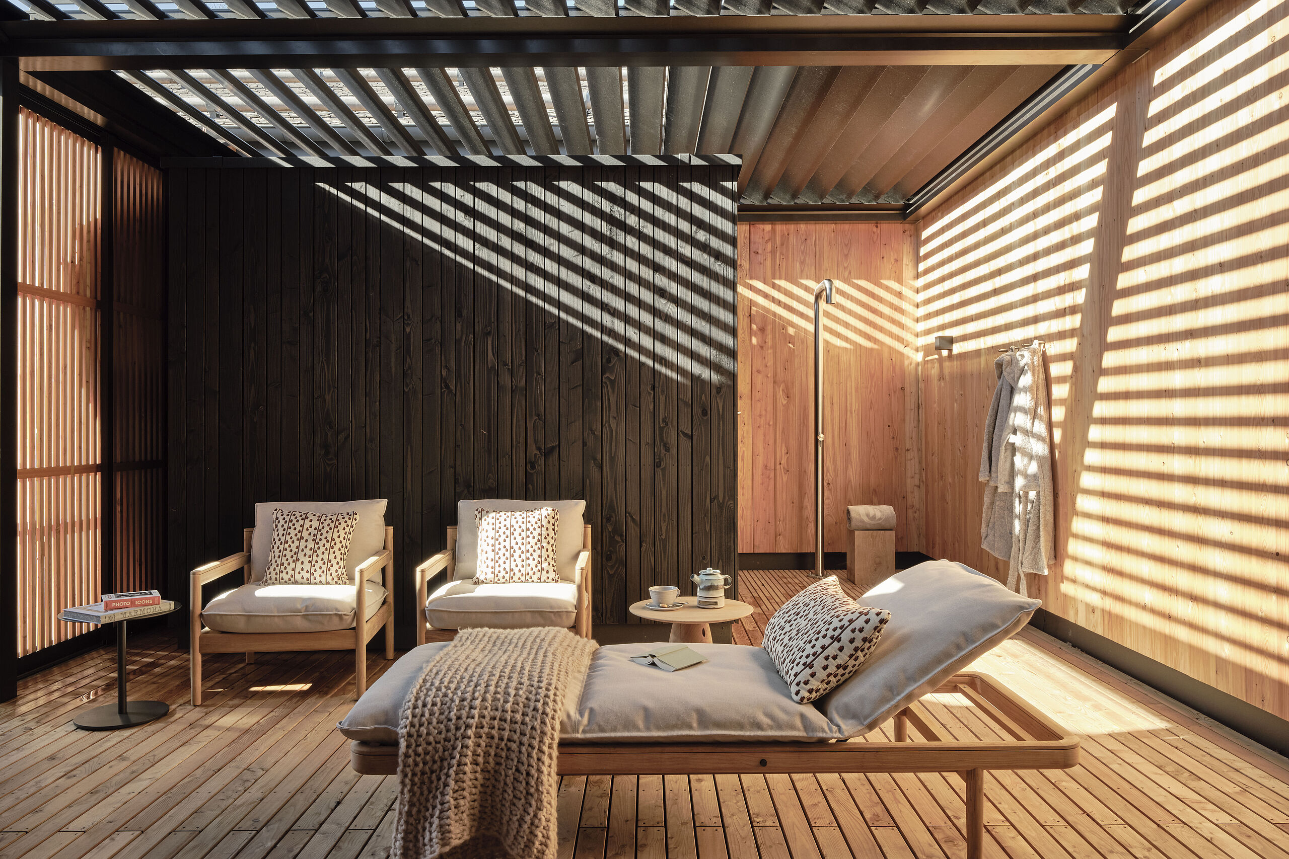 Die Chiemsee Spa Suite überzeugt mit einer großen Terrasse, luxuriösen Möbeln, steuerbarer Pergola, privater Outdoor-Sauna und Dusche – perfekt für entspannte Privatsphäre.