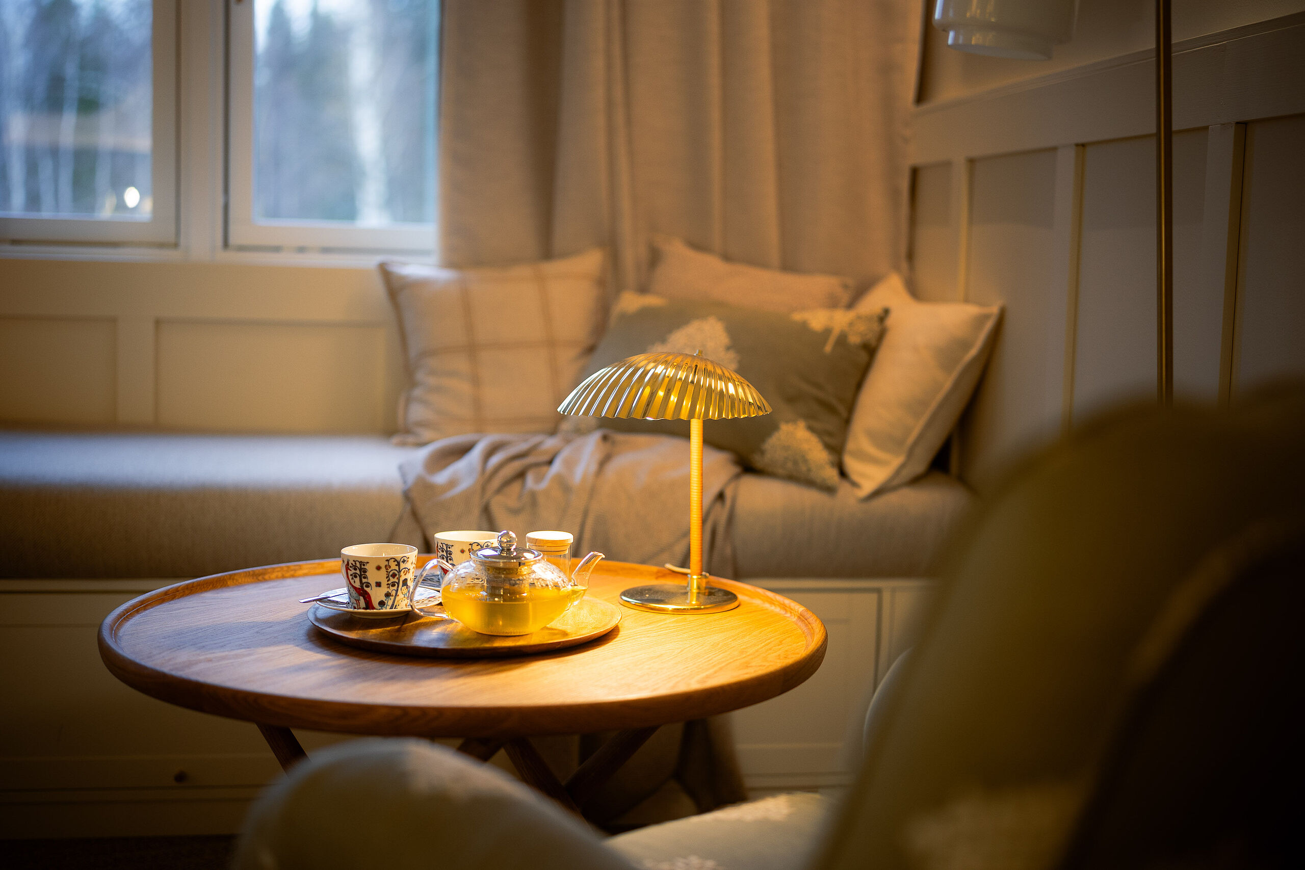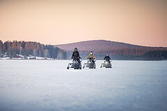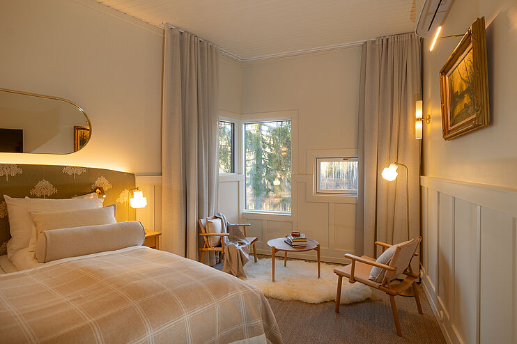 Die Zimmer öffnen sich mit großen Fenstern zum Wasser und wirken hell, gemütlich und unaufdringlich. Natürliche Materialien, viel Platz und eine sanfte Farbwelt sorgen dafür, dass man sich schnell angekommen fühlt. Abends duftet es im Kota Restaurant nach Feuer und regionalen Zutaten. Die Gerichte sind einfach, frisch und mit viel Liebe zur Region zubereitet – genau das Richtige, wenn draußen Schnee fällt oder der Himmel langsam dunkler wird. Am Ufer warten zwei Saunen und ein Hot-Tub, die das Gefühl der Ruhe perfekt ergänzen. Zwischen wohliger Wärme und kühler Luft entsteht dieser typische Lapplandmoment. Und wenn sich dann noch das Nordlicht zeigt, wirkt die Insel wie ein Ort außerhalb der Zeit – ruhig, naturverbunden und unvergesslich.