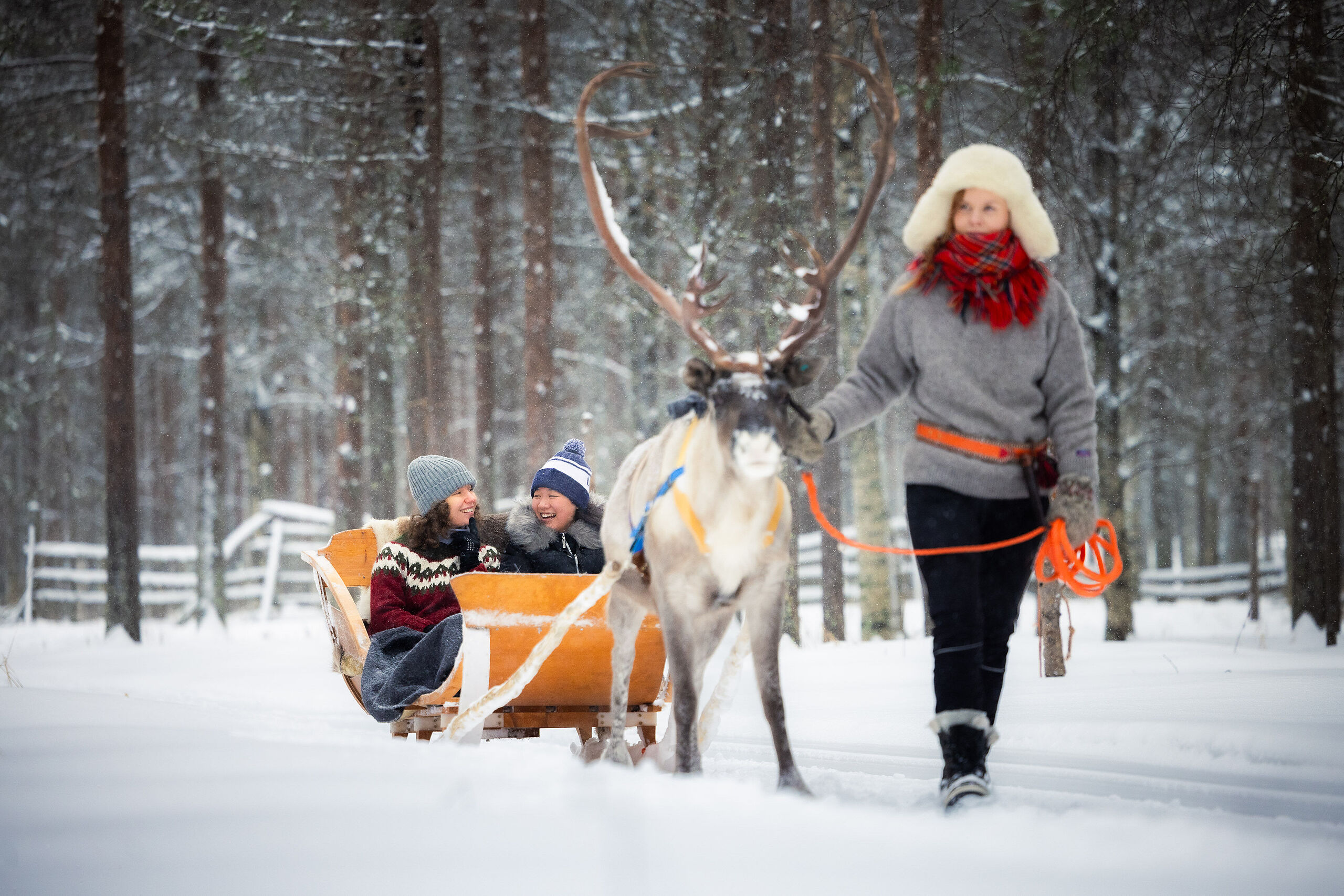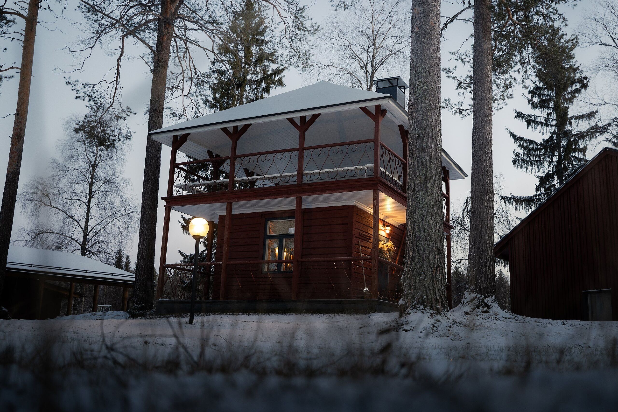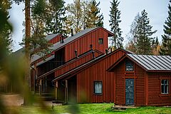Auf der kleinen Insel im Kemijoki entsteht sofort das Gefühl, in eine ruhigere Welt einzutauchen. Der Fluss gleitet leise vorbei, ringsum stehen Kiefern, und das klare Licht Lapplands legt sich weich über die Landschaft. Die Gebäude aus Holz fügen sich harmonisch ein, warm und schlicht – genau richtig für einen Ort, der von Natur und Stille lebt.