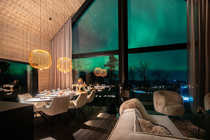 Sobald der Abend naht, ist die abgelegene Lage der Lodge perfekt, um die mythischen Nordlichter zu betrachten, weitab von Stress, Hektik oder Lichtverschmutzung.