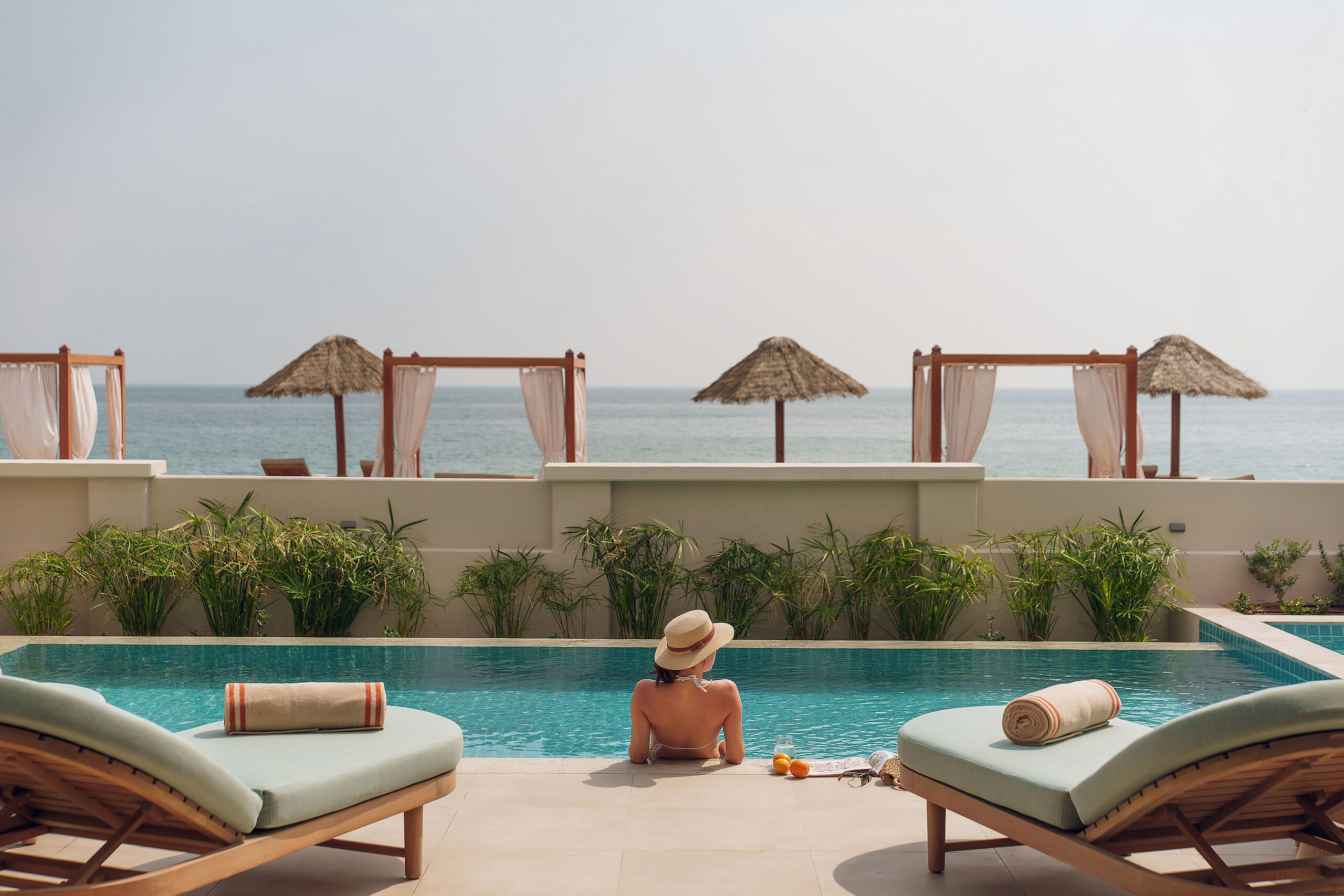 Jede der 44 Villen bietet einen privaten Pool, einen stillen Garten und persönlichen Butlerservice. Warme, raffinierte Innenräume mit handgefertigten Holzarbeiten, erdigen Tönen und edlem italienischem Marmor spiegeln die umliegenden Berge und das Meer wider. Ob am Strand oder in den Hügeln – großzügiger Raum, sanftes Licht und ruhige Momente begleiten den Tag, vom morgendlichen Bad bis zum Frühstück auf der Terrasse.
