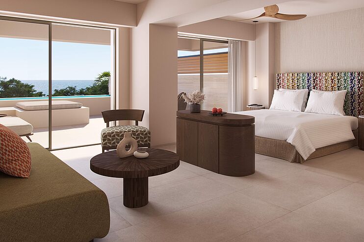 Ein Rückzugsort der Extraklasse: Panorama-Fenster, Kingsize-Bett, Schlafsofa, Walk-in-Wardrobe, luxuriöses Bad und eine private Infinity-Pool-Terrasse mit Daybed, Lounge-Möbeln und Hängesessel für unvergleichliche Entspannung am Meer.