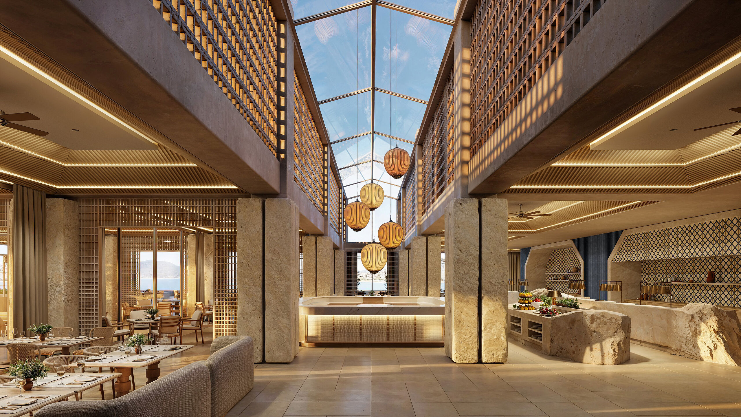 Im mediterranen Restaurant Lithos verschmelzen akribische Handwerkskunst und kulinarische Kreativität zu exquisiten Gerichten, begleitet von Blicken auf antike Steinbruchruinen und einem reichhaltigen Frühstücks- sowie À-la-carte-Abendmenü.