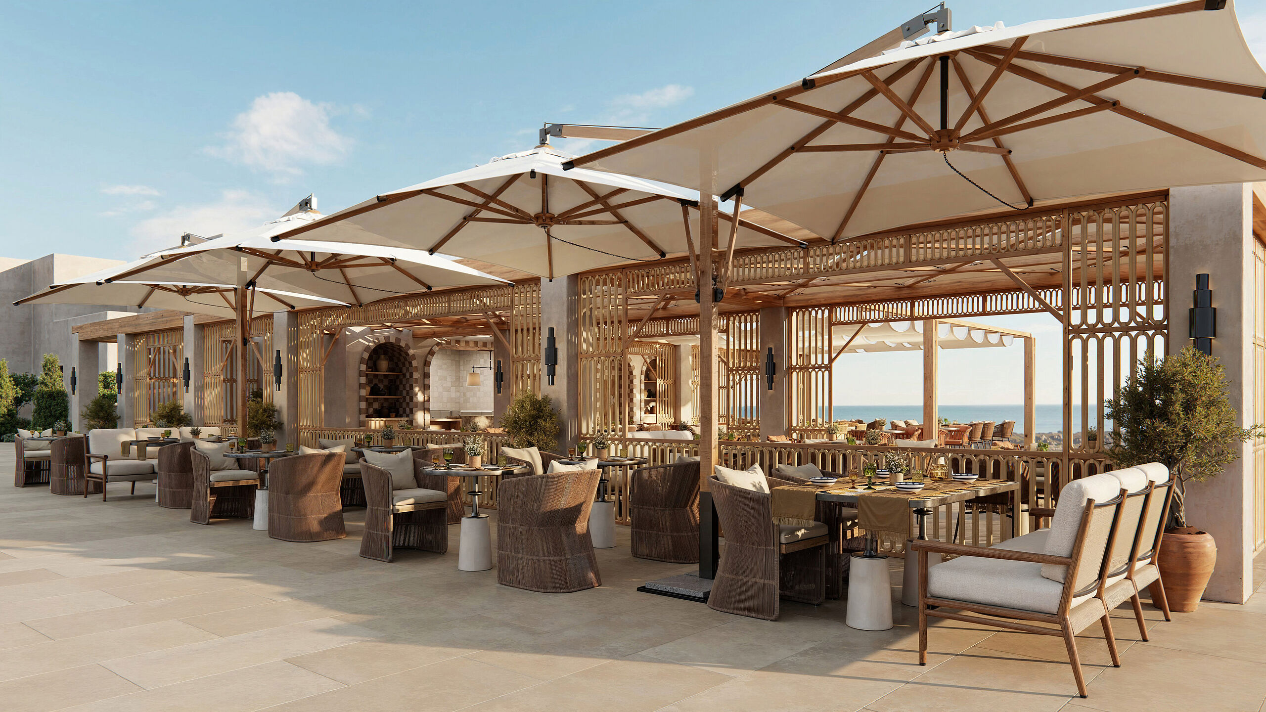 Der Hemera Sea View Room bietet eine elegante Rückzugsoase mit Kingsize-Bett und privatem Balkon, von dem sich ein ungestörter Ausblick auf das Meer eröffnet.