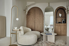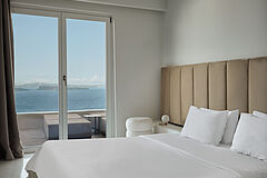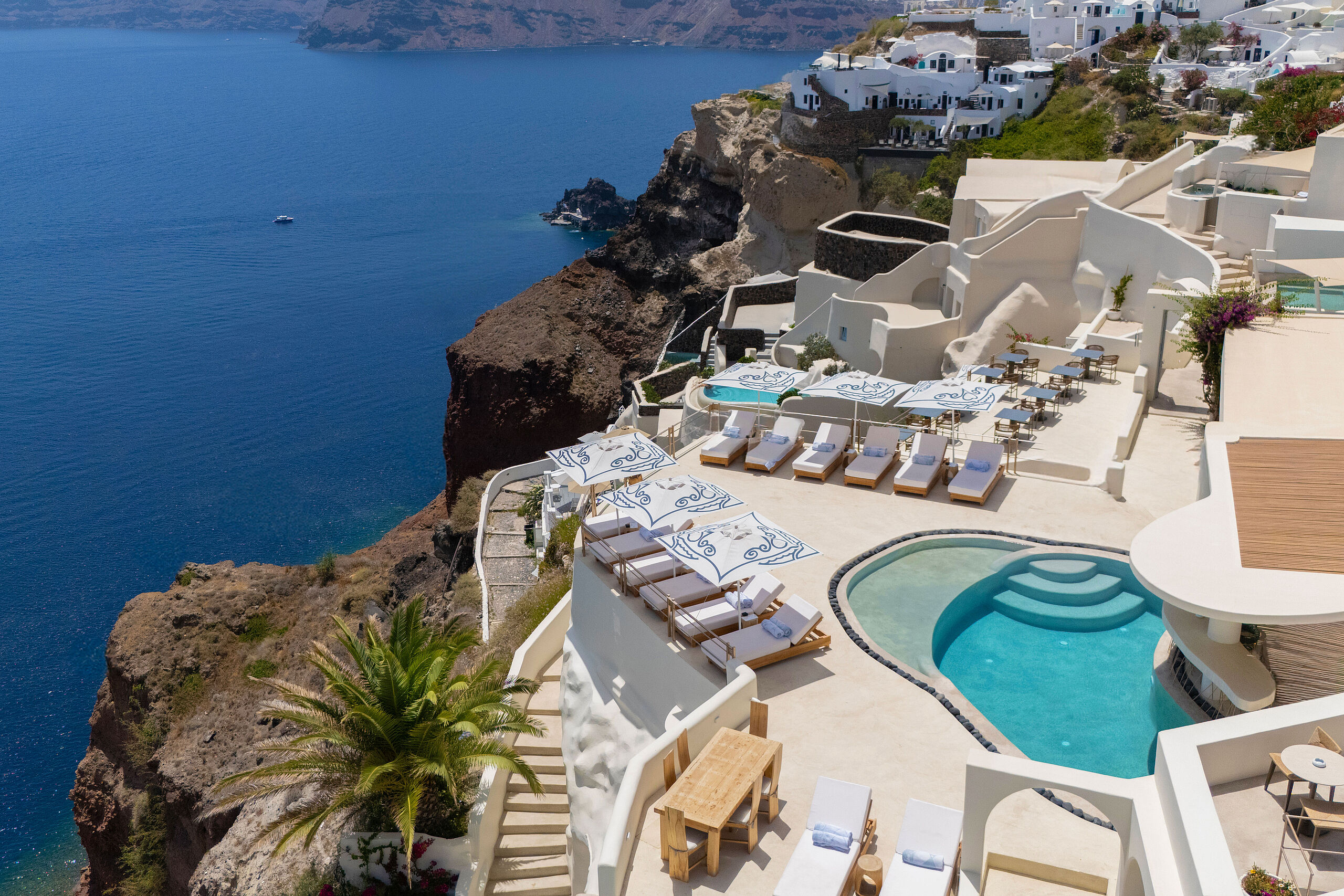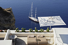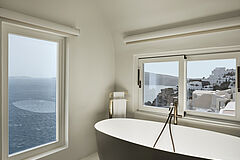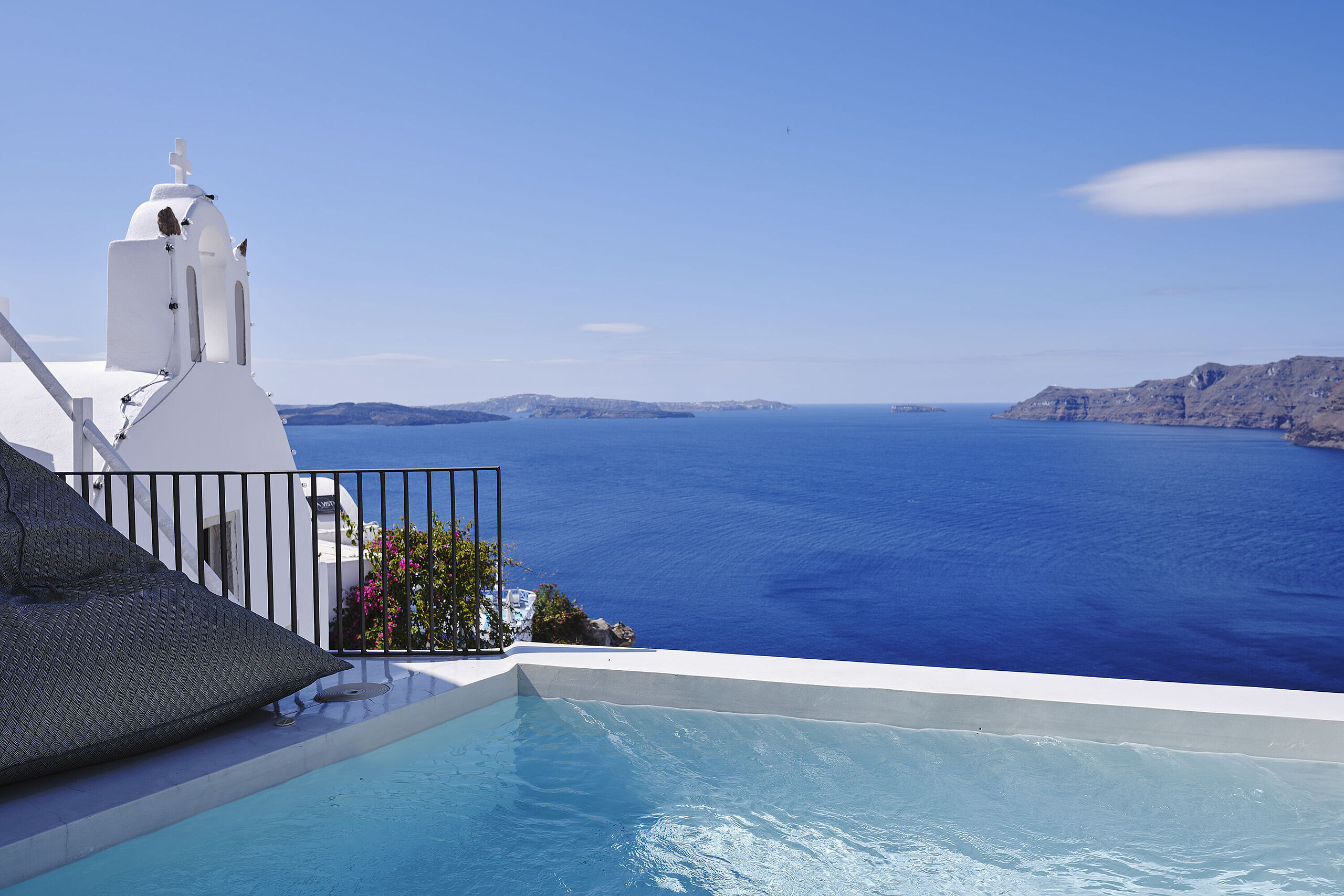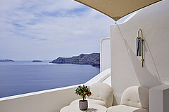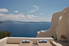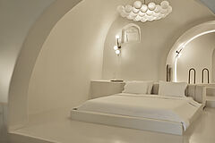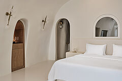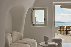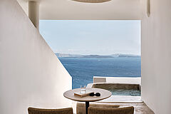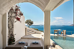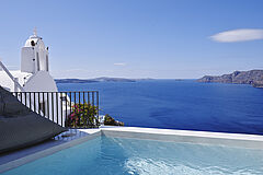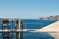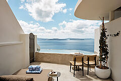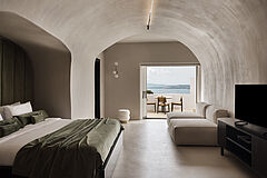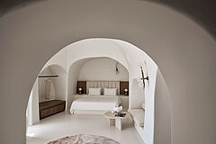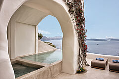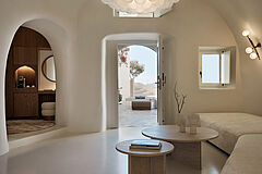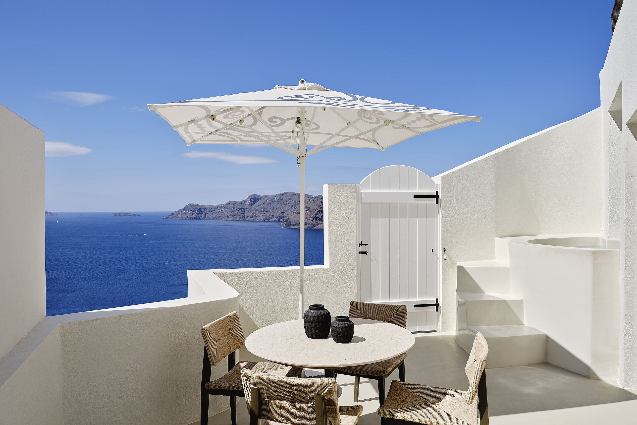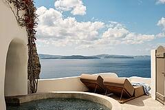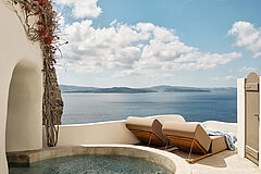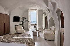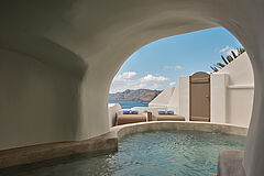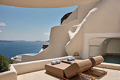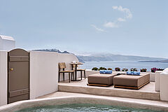 Eine großzügig geschnittene Suite mit eleganter Einrichtung. Auf der privaten Terrasse lädt ein Plunge‑Pool zu entspannten Stunden mit atemberaubendem Blick über die Caldera ein.