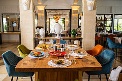 Auf der ersten Etage gelegen eröffnet die Executive Suite einen direkten Meerblick und eine großzügige Raumatmosphäre, in der mediterrane Farben und Licht Akzente setzen.