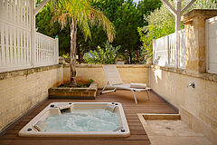 Diese harmonisch gestalteten Zimmer öffnen sich zu einem privaten Patio oder Balkon mit Blick in den Garten und verbinden mediterrane Materialität mit zeitgenössischem Komfort. Marmorbäder mit Jacuzzi‑Badewanne oder großzügiger Walk‑in‑Shower unterstreichen die sanfte Eleganz.