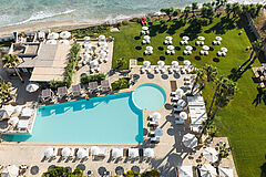 Leicht großzügiger und mit privatem Balkon, bieten die Superior‑Zimmer Ausblicke auf die gepflegten Gärten oder teilweise das Meer, geprägt von warmen Naturtönen und raffinierter Materialwahl.