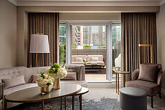 Eine elegante Suite mit großzügigem Wohnbereich, privatem Arbeitsbereich und Details, die Luxus und Residential‑Charakter vereinen.