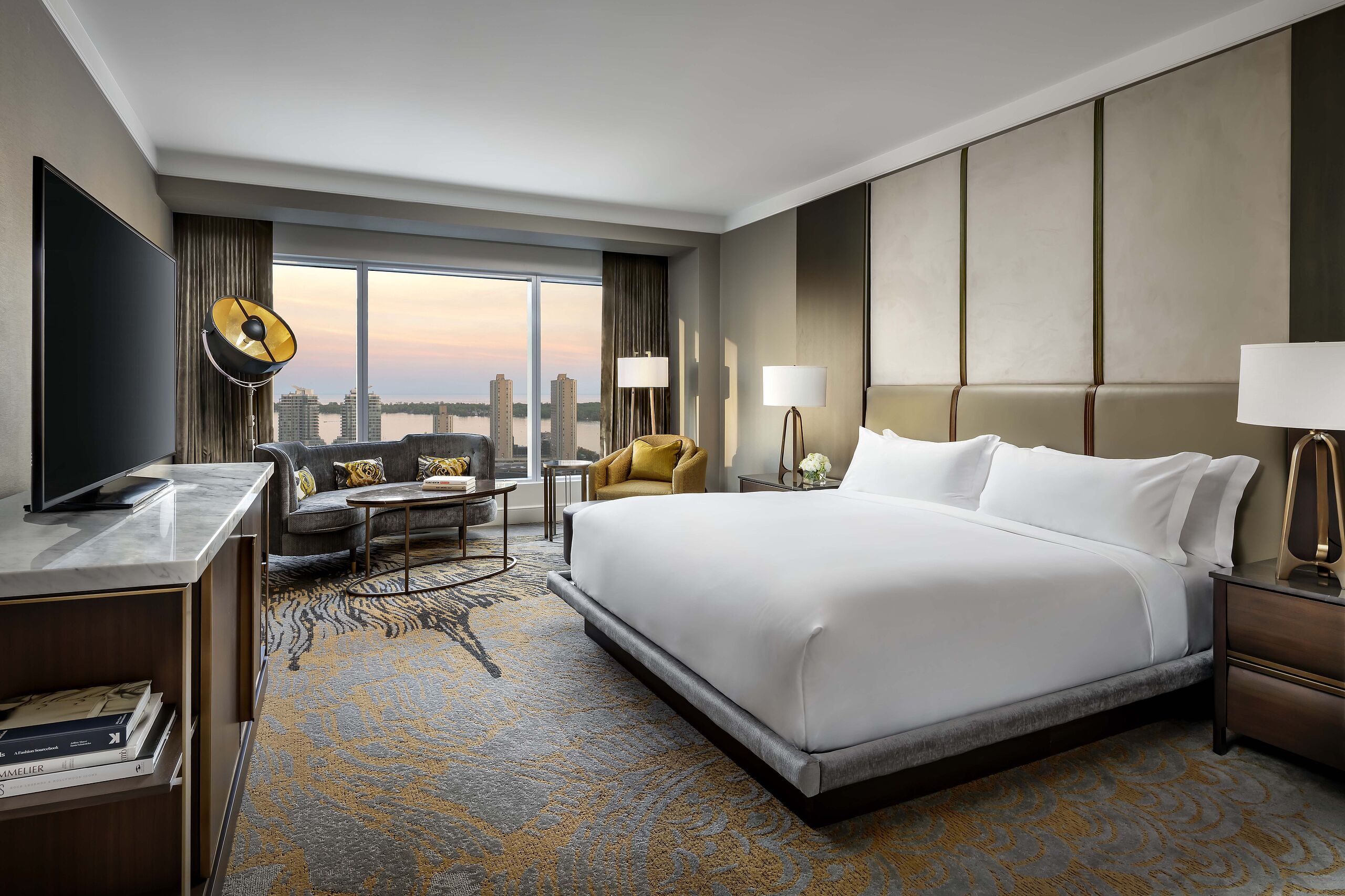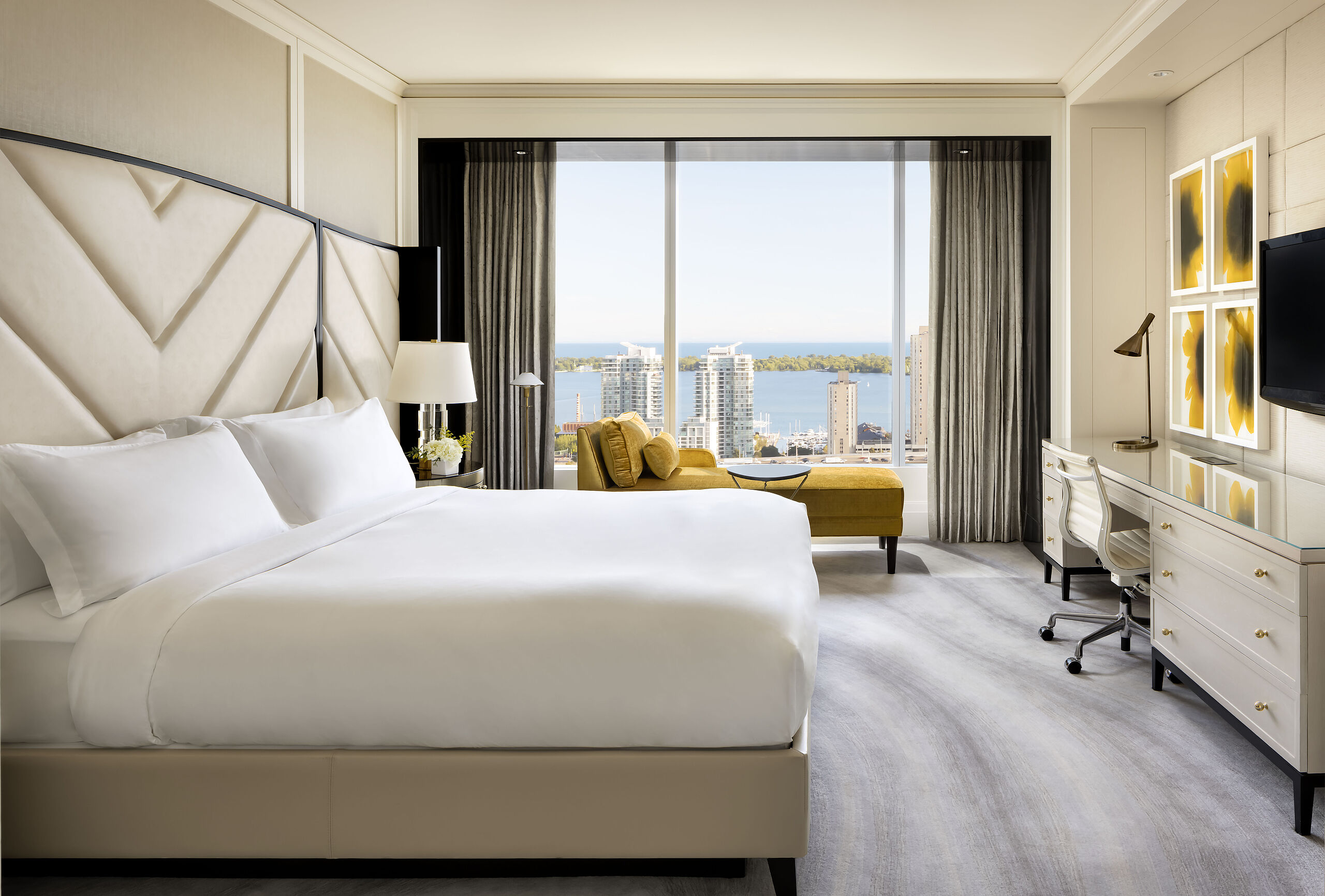 Ein Gästezimmer mit elegantem Interieur und komfortabler Ausstattung, die durch bodentiefe Fenster viel Licht und einen Blick auf Stadt oder See einfangen.