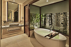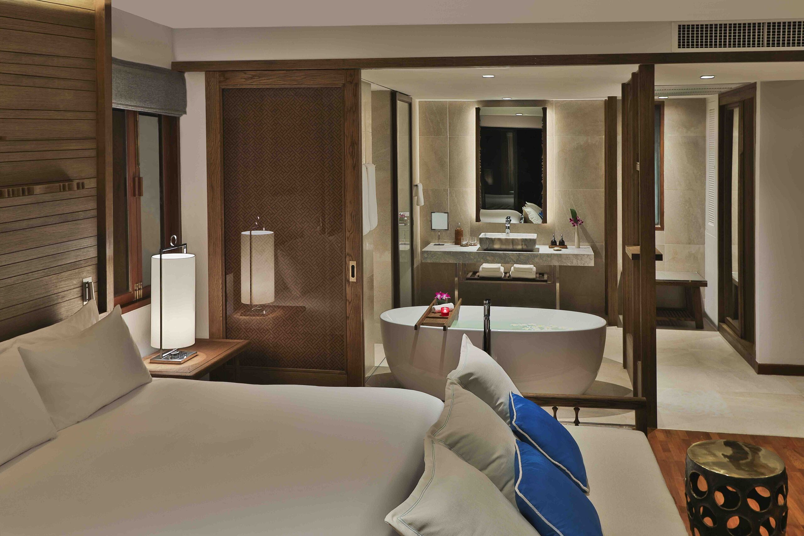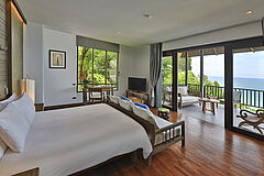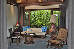 Die 121 Zimmer schmiegen sich an den terrassenförmigen Aufbau des Hotels am Hang entlang und bieten somit hervorragende Aussichten auf das Meer und die grüne Dschungel-Landschaft. Der Baustil ist asiatisch und für die Ausstattung der Zimmer wurde viel Holz verwendet.