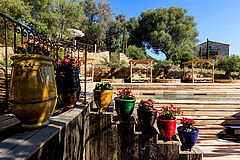 Die Pera‑Zimmerkategorie verführt mit einer warmen Farbpalette und einem Blick in die umliegenden Gärten, der die mediterrane Landschaft ins Zimmer trägt.