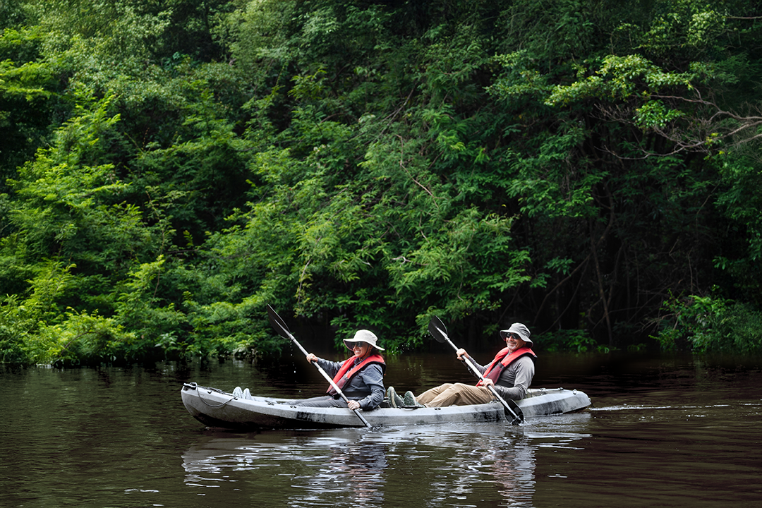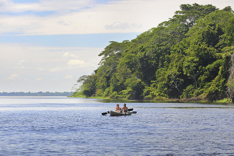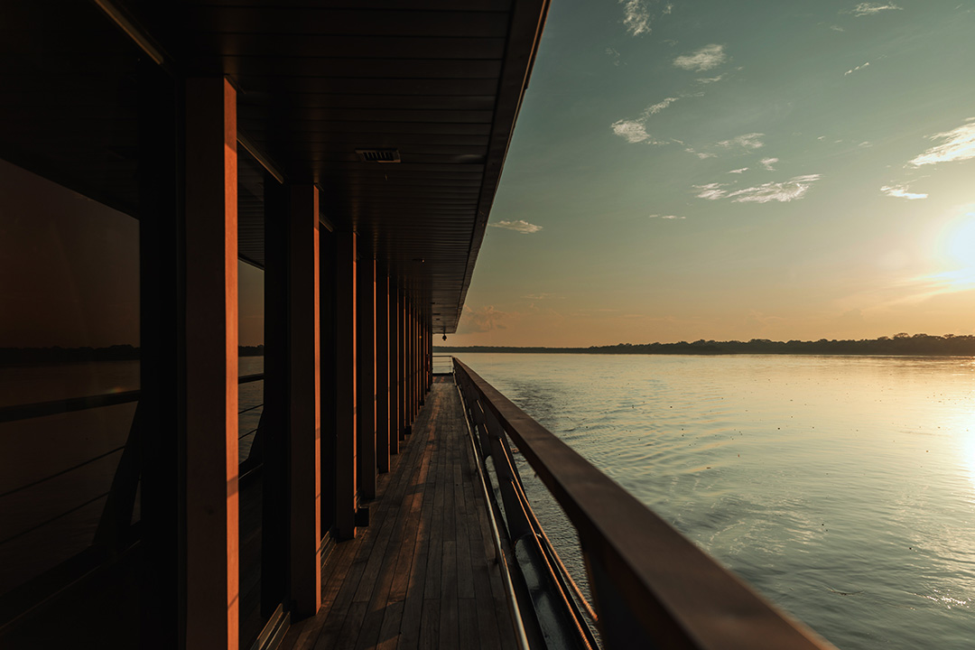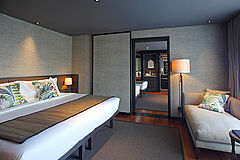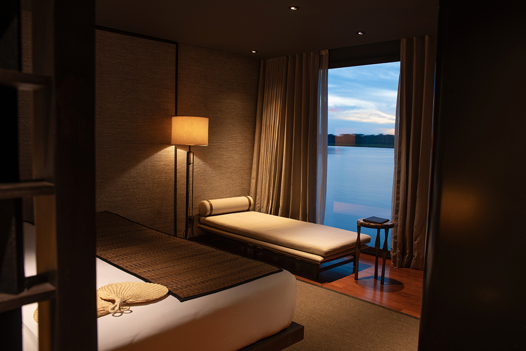 Die Deluxe Suite überzeugt durch ein durchdachtes Raumkonzept und elegante Zurückhaltung. Hochwertige Materialien und eine ruhige Farbwelt schaffen ein behagliches Ambiente mitten im Amazonasgebiet.