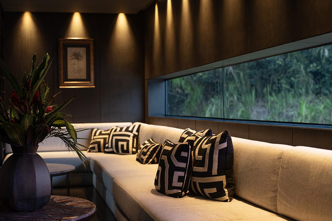 Die Design Suite präsentiert sich als stilvoller Rückzugsort mit bodentiefen Panoramafenstern und weitem Blick auf den Regenwald. Edle Materialien, klare Formen und viel Tageslicht schaffen ein Gefühl von Weite und Ruhe.