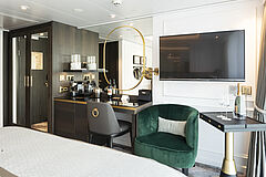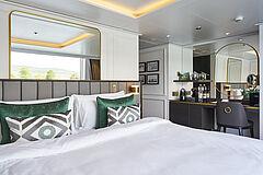 Sie ist mit knapp 18 Quadratmetern ein bisschen kleiner, dennoch genießen Sie in einer Symphony Suite großen Komfort. Betten Sie sich in Bezügen aus feinster Baumwolle und beginnen Sie den Tag mit einem Tee oder einem Kaffee im Bett und blicken Sie hinaus ins Freie. Die Regendusche im Bad mobilisiert Energie für den Tag. Ein kleiner Schreibtisch bietet Ihnen die Möglichkeit, Notizen zu machen – eine Reise mit der Ravel ist schließlich reich an Erlebnissen.