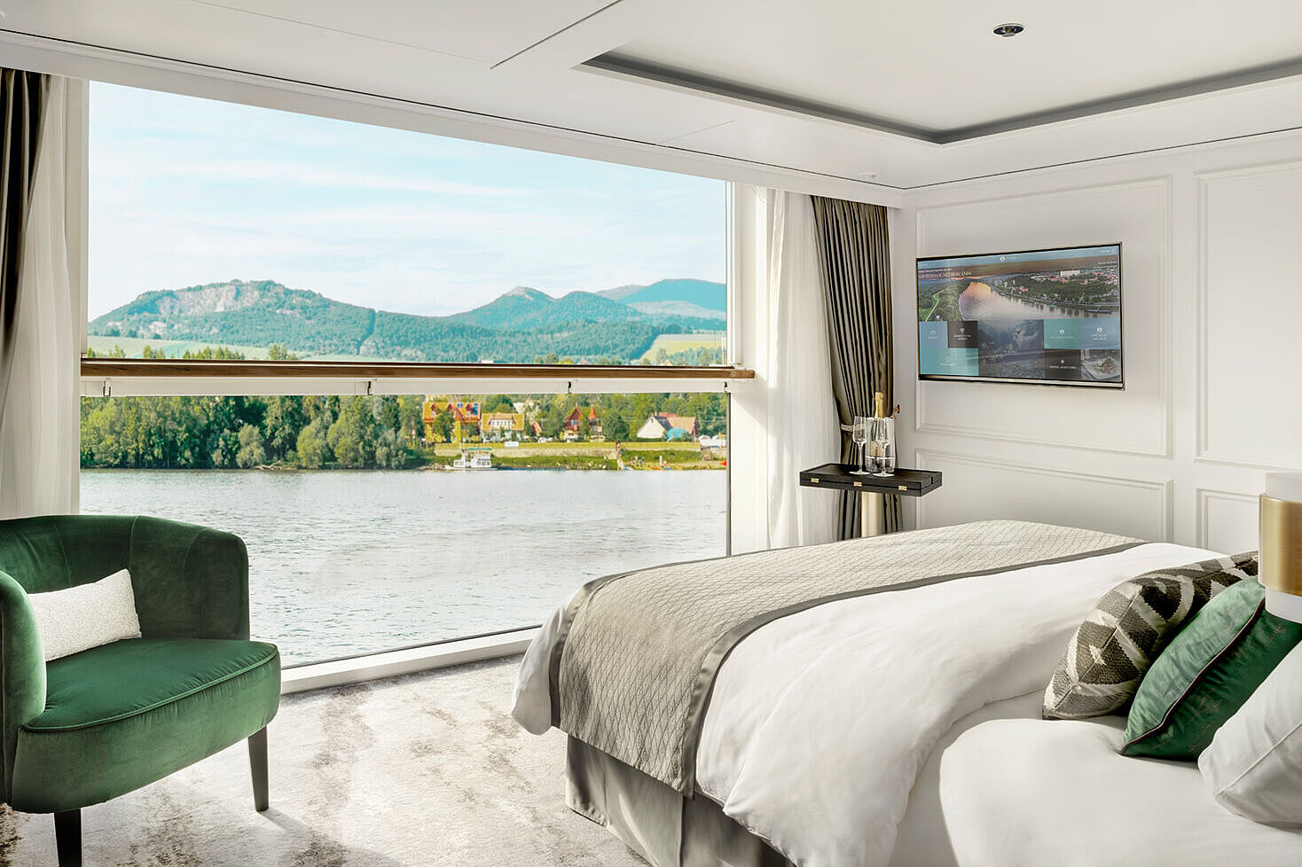 Die Owner’s Suite eröffnet mit zwei stilvoll getrennten Schlafzimmern, einem großzügigen Wohn‑ und Essbereich sowie eleganten Details einen Raum, der sich wie ein privates Penthouse über den Flusslandschaften anfühlt.