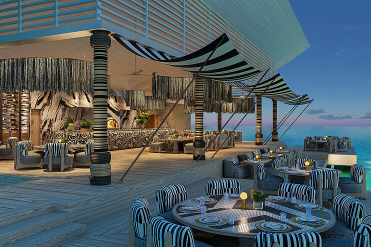 Eine zentrale Bar mit versenkten Cabanas und knisternden Feuerstellen schafft Raum für gemeinsame Momente, während köstliche Kreationen den perfekten Ausklang eines Tages begleiten.