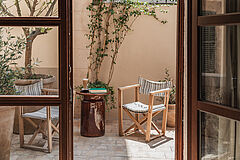 Die Sonnenterrasse vereint skandinavisches und spanisches Design mit üppigem Grün zu einer ruhigen Oase – tagsüber ein Rückzugsort für Gäste, abends ein Ort für Drinks unter dem mallorquinischen Sternenhimmel.