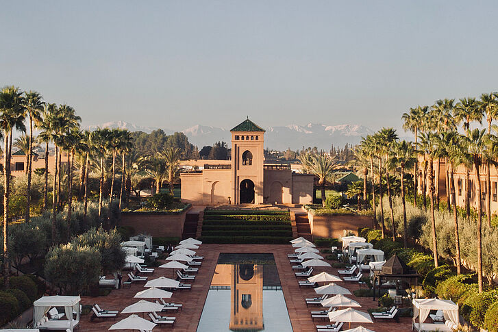 Herzlich Willkommen im neu eröffneten Luxushotel Mandarin Oriental Marrakesch! Das luxuriöse Hotel ist eine wahre Oase der Ruhe und Entspannung unweit von der Medina, der historischen Altstadt Marrakeschs entfernt. Erleben Sie hier herzliche Gastfreundschaft mit einem asiatischen Touch und dem für Mandarin Oriental berühmten, zuvorkommenden Service. Das Luxushotel liegt eingebettet in einem 20 Hektar großen Garten mit einem Meer aus Rosen und Bougainvillea und einem traumhaften Ausblick auf das Atlasgebirge. Die 54 luxuriös ausgestatteten Villen und die neun eleganten Suiten des Mandarin Oriental Marrakesch sind alle im traditionellen Stil der Berber eingerichtet und mit maurischen Einflüssen gestaltet. In den Gärten der Villen gibt es einen privaten Swimmingpool und wunderschöne Terrassen, die zum Sonnenbaden und Relaxen im Freien einladen. Die Suiten des Luxushotels verfügen über eine exklusive Dachterrasse mit Pool – von hier oben haben Sie einen wirklich tollen Blick auf die Gärten und die Landschaft rund um Marrakesch. Einfach zurück lehnen und entspannen!