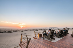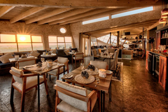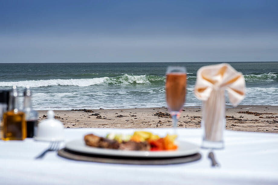Die Kulinarik der Shipwreck Lodge verbindet schlichte Raffinesse mit der eindrucksvollen Kulisse der Skelettküste. Im zentralen Restaurant entstehen täglich wechselnde Menüs, die in entspannter Atmosphäre serviert werden und den Blick auf Dünen, Nebel und Atlantik begleiten.