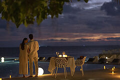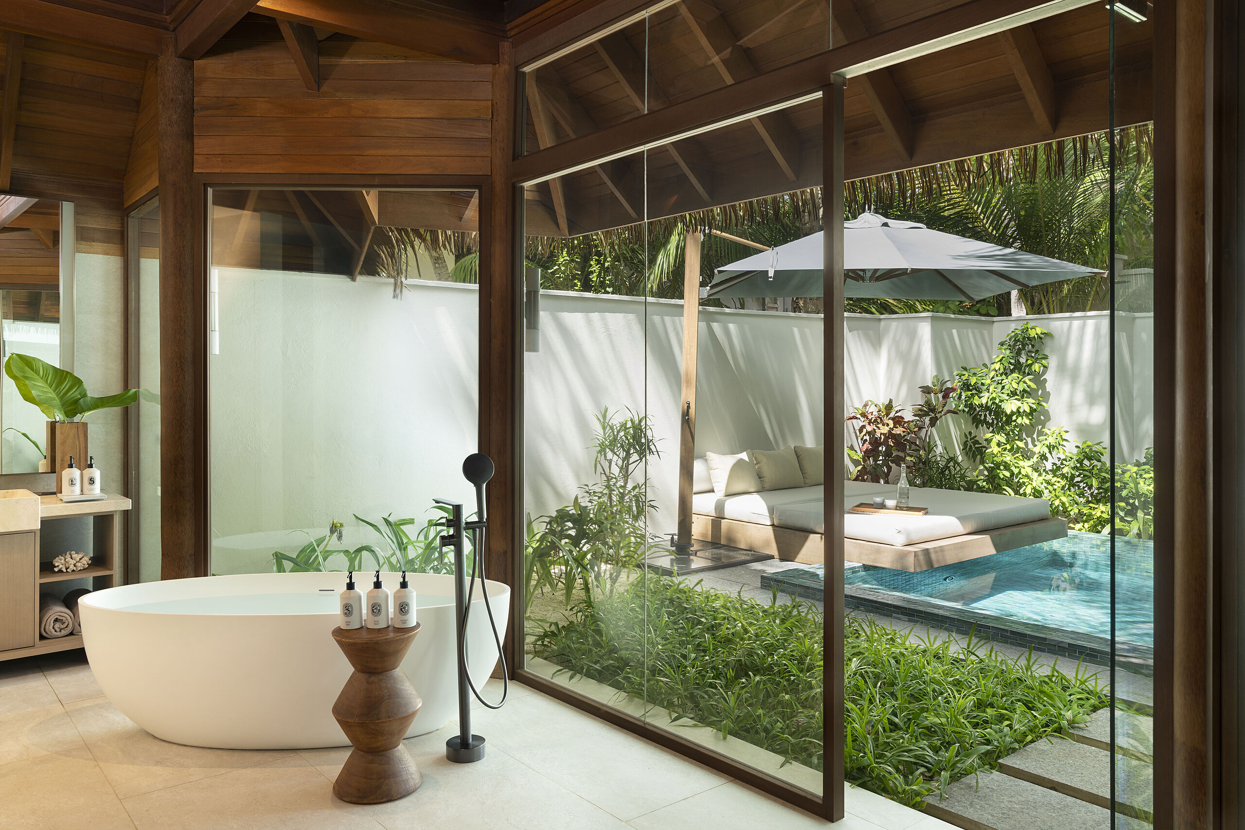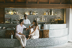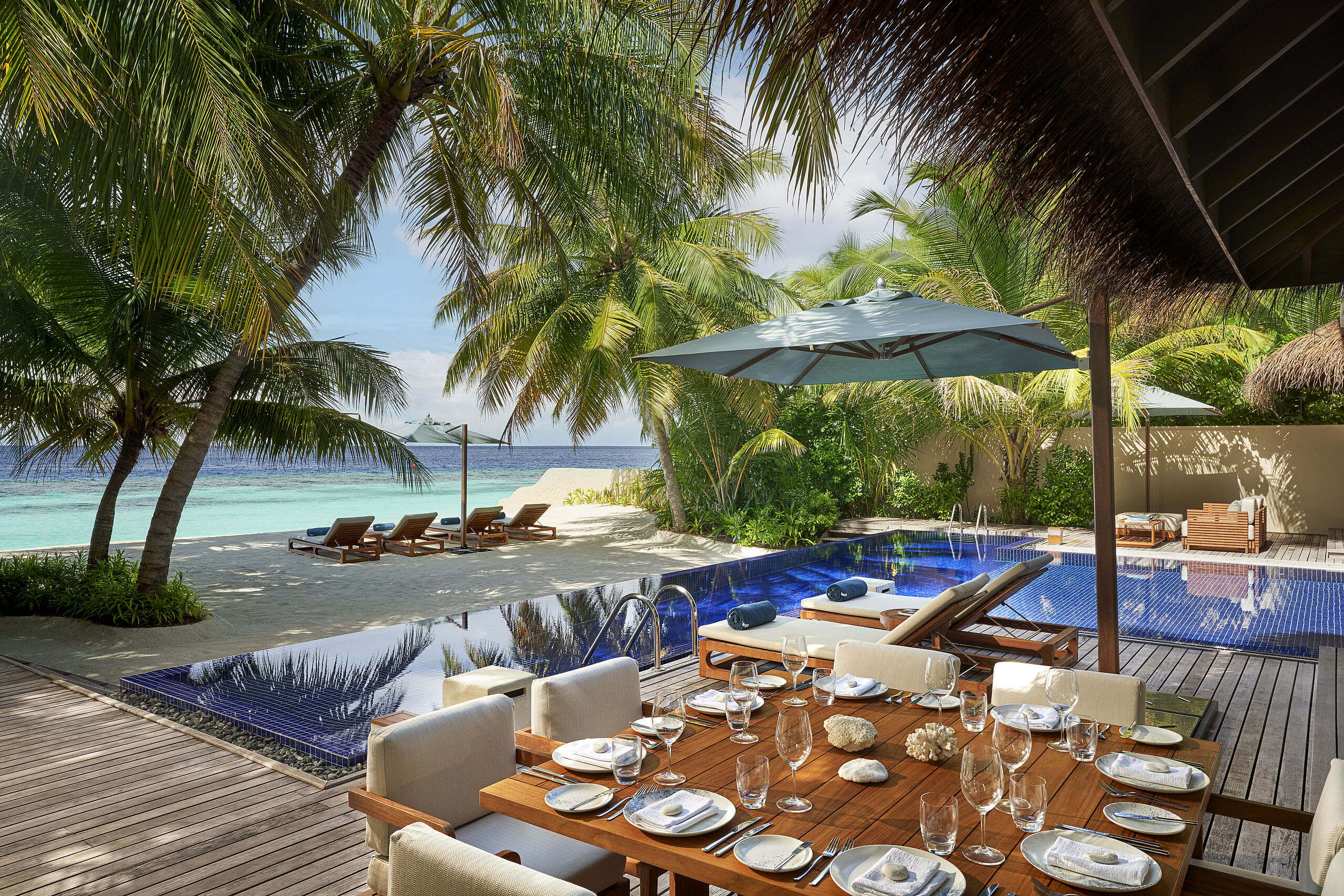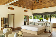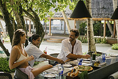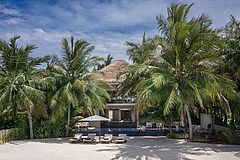 Ihre entspannten Tage verbringen Sie in einem der insgesamt 44 kleinen und geschmacksvollen Bungalows in tropischer Vegetation oder auf Stelzen im Meer. Jeder Bungalow verfügt über einen privaten Pool, in dem Sie jederzeit in das kühle Nass eintauchen können. Hohe, offene Räume mit klaren Linien und ein stilvolles Interieur geben der Athmosphäre einen besonderen Flair. Dunkles Holz harmoniert perfekt mit moderner Einrichtung und silbernen Kunstobjekten. Von Ihrer privaten Terrasse aus haben Sie einen endlos scheinenden Ausblick auf das türkisblaue Meer. Ein eigener Butler steht Ihnen rund um die Uhr zur Verfügung und kümmert sich um Ihr Wohl.