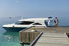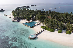 Das Huvafen Fushi macht seinen Namen alle Ehre. Umgeben von einer türkisblauen Lagune, schneeweißen Sandstränden und tropischer Vegetation liegt das Luxushotel im westlichen Nord-Malé-Atoll. Die Insel ist nur 350 Meter lang und 100 Meter breit und verführt mit einer entspannten und luxuriösen Atmosphäre. Der Flughafen auf Malé ist in 30 Minuten per Speedboat zu erreichen.