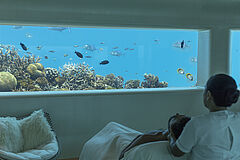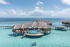 Die Bungalows auf dem Wasser: Lagoon Bungalows with Pool (ca. 130 qm), Ocean Bungalows with Pool (ca. 160 qm) und die Two Bedroom Ocean Pavilions with Pool haben einen Glasboden, sodass Sie farbenfrohe Fische und gigantische Rochen im glasklaren Wasser vorbeischweben sehen können.