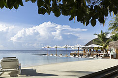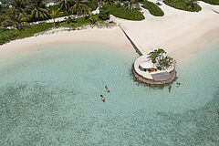 Huvafen Fushi heißt übersetzt ›Trauminsel‹. Und genau die finden Sie im Nord-Malé-Atoll. In nur 30 Minuten flitzen Sie mit dem Schnellboot vom internationalen Flughafen zu dieser wundervollen Oase, die nur 350 Meter lang ist. Damit Sie völlig ungestört in Ihrer Villa sind, verstecken sich die 44 schönen Bungalows mit privaten Pools in der tropischen Vegetation oder thronen auf Stelzen im Meer. Die hohen, offenen Räume lassen die reine Salzluft herein- strömen, im Interieur geben warme Nuancen von Braun den Ton an. Nichts soll von der traumhaften Natur ablenken. Vom herrlichen Hausriff, vom türkis leuchtenden Meer, von der kunterbunten Unterwasserwelt, die Sie auch vom weltweit ersten und bisher einzigen Unterwasser-Spa aus bei wohltuenden Behandlungen genießen können. Und doch geht es im Huvafen Fushi auch um Lifestyle: Künstler und DJs aus aller Welt treffen sich hier und stellen ihre Werke aus oder lassen ihre Rhythmen erklingen. Kunst auf dem Teller gibt es in vier verschiedenen Restaurants, edle Tropfen aus einem der größten Weinkeller der Malediven, besonders Gesundes im Rohkostrestaurant Raw mit seiner Bar über dem Riff. Once-in-a-lifetime-Food-Experience gesucht? Dann Bon Appetit am im Sand versunkenen Tisch oder bei Tafelfreuden auf der Sandbank oder im einzigen Unterwasser-Spa der Malediven.