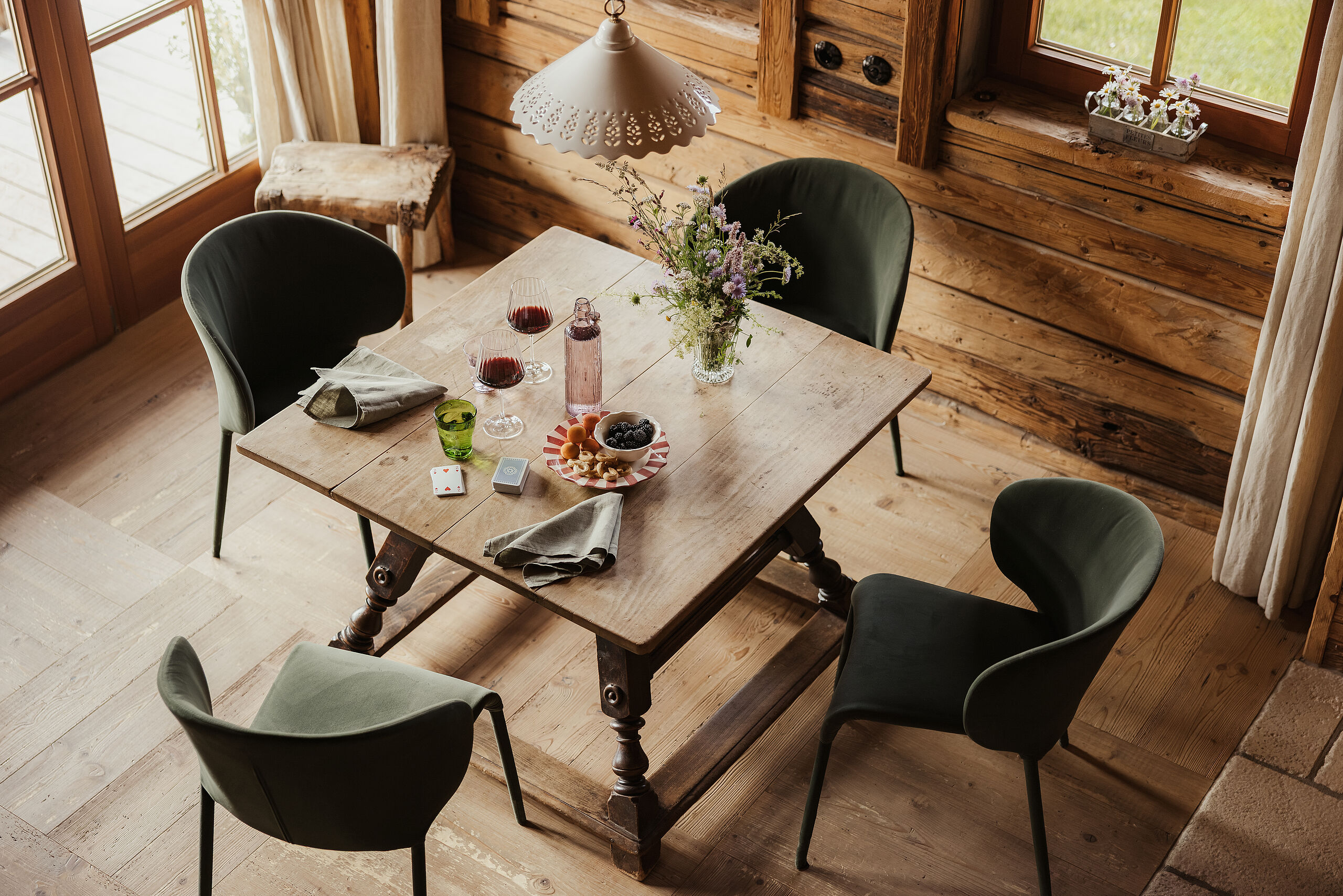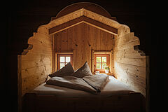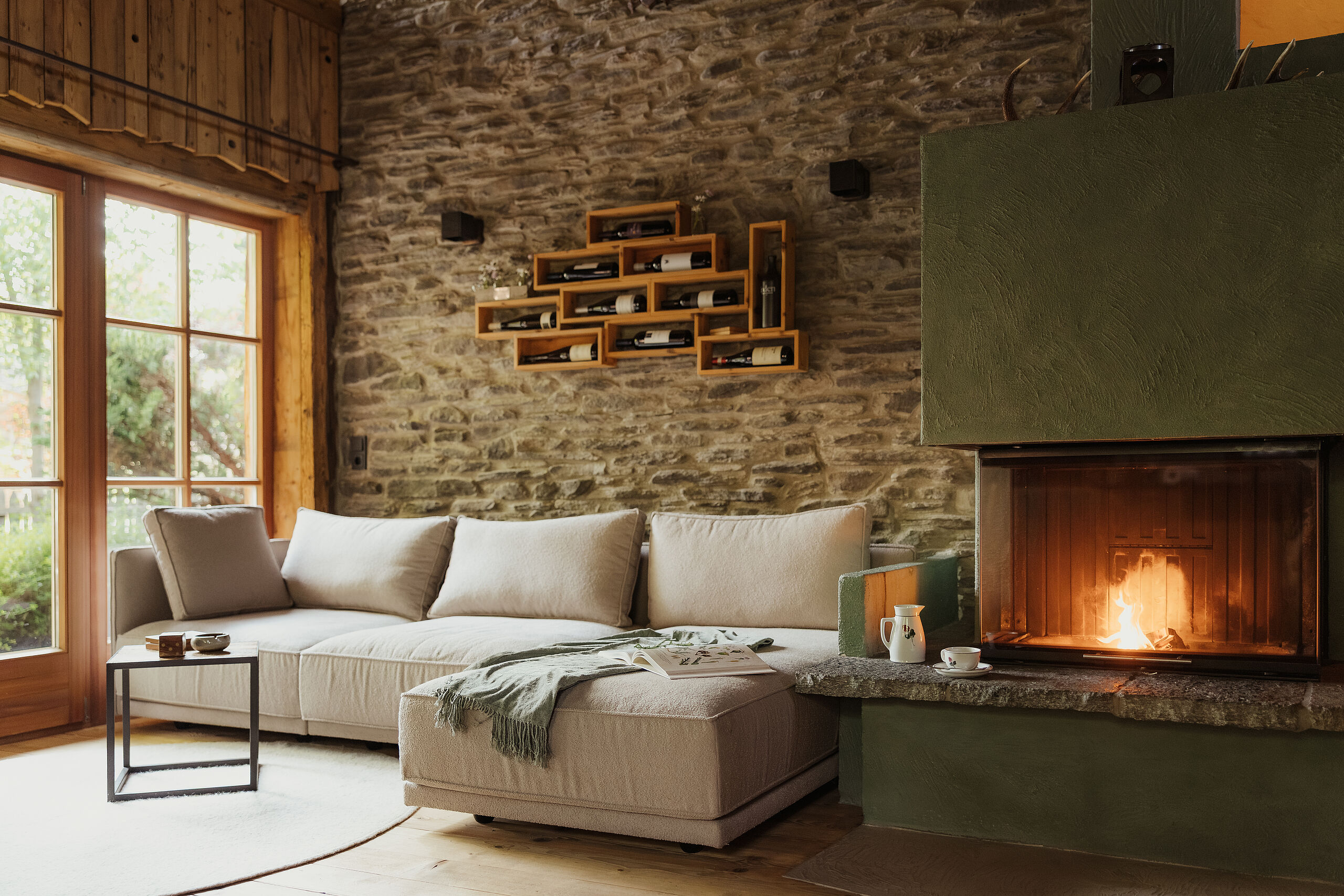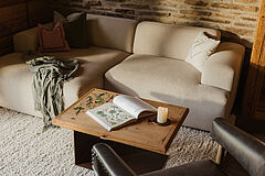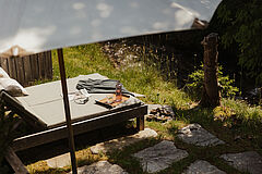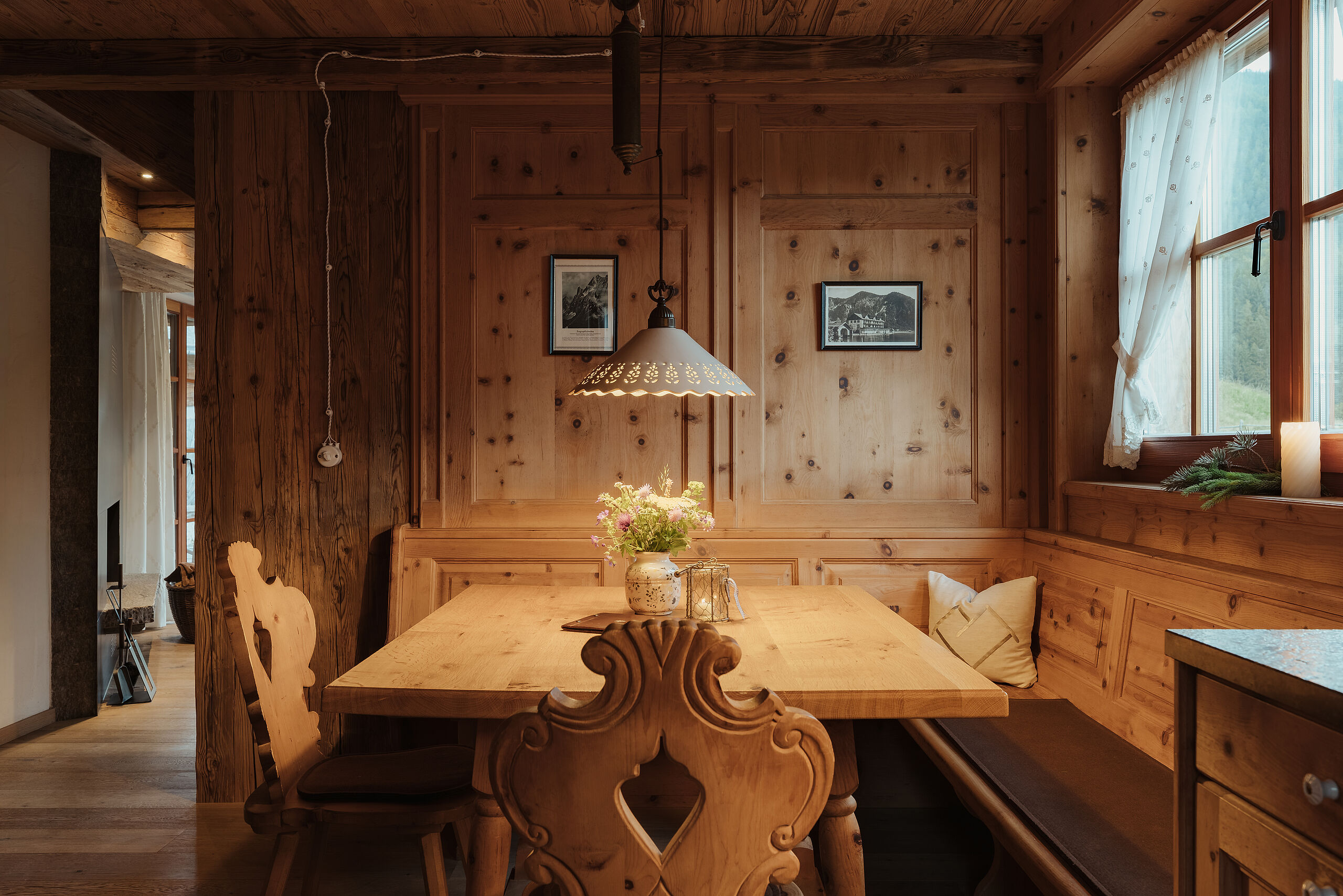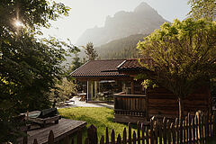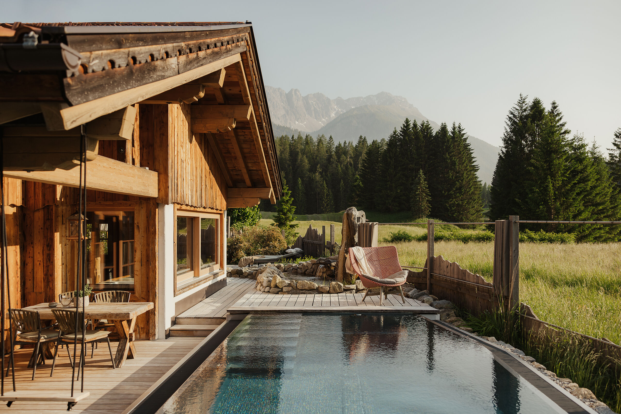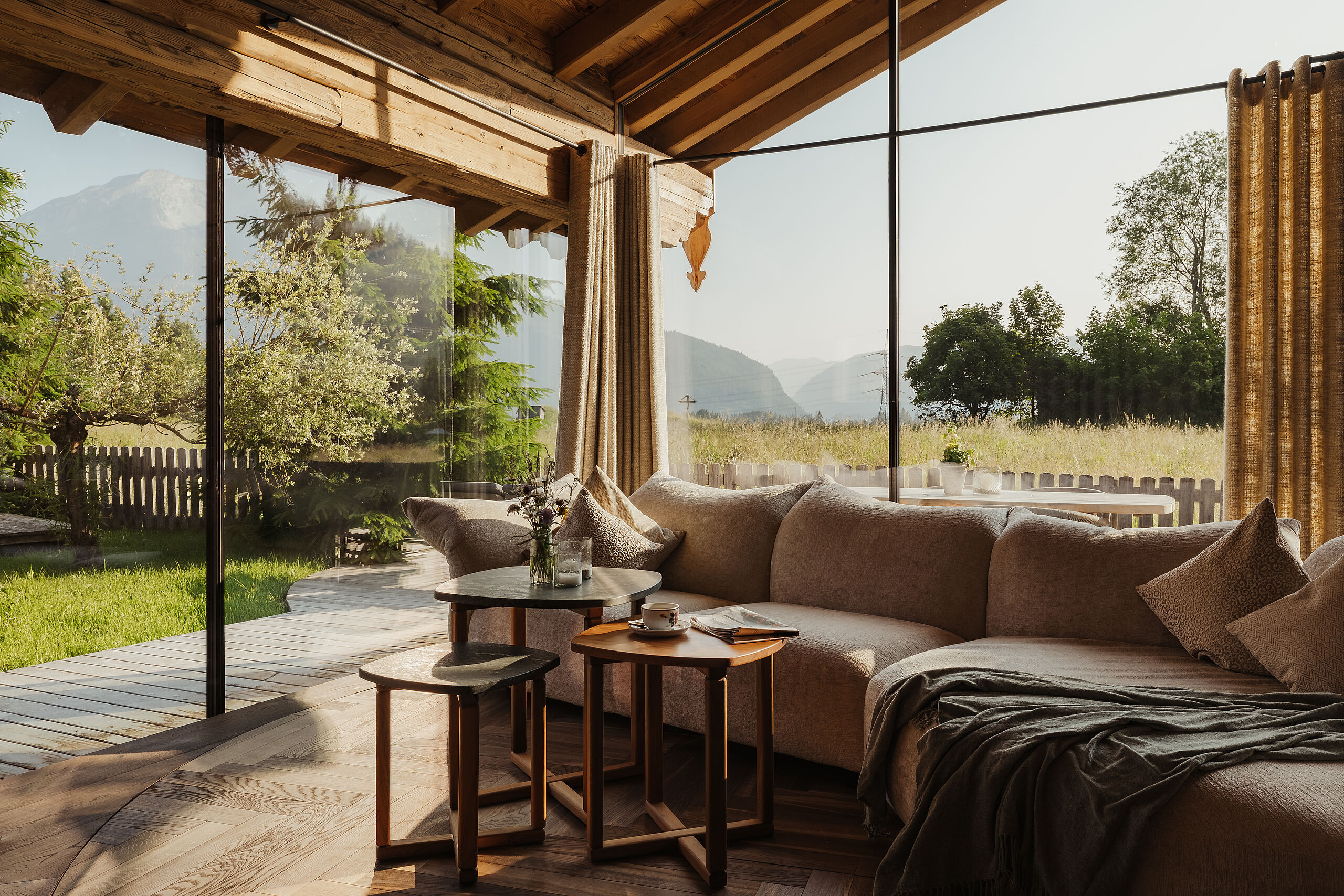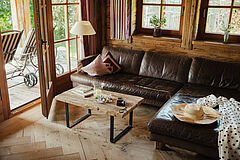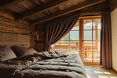 Weiche Stoffe und warme Farbtöne spiegeln die lebendige Tiroler Tradition wider und laden am knisternden Kamin zum Wohlfühlen ein. Die behagliche Atmosphäre auf der Chalet-Terrasse sorgt für entspannte Stunden unter dem klaren Sternenhimmel – ganz ungestört, hoch oben in den Bergen.