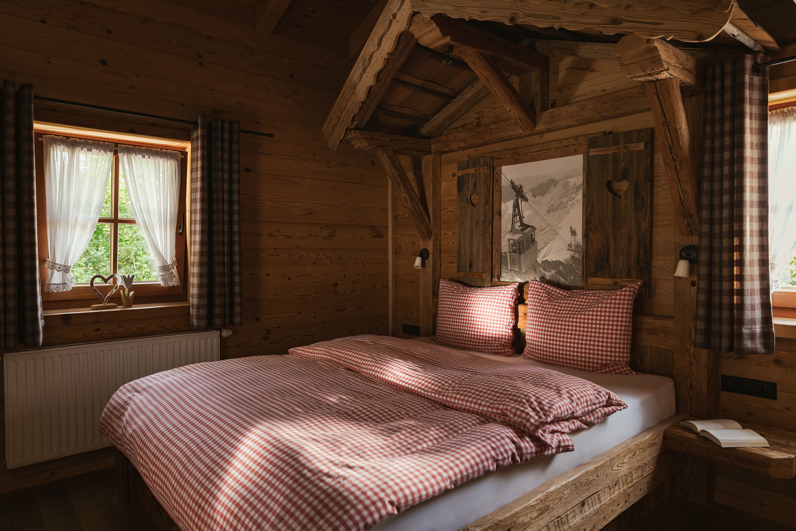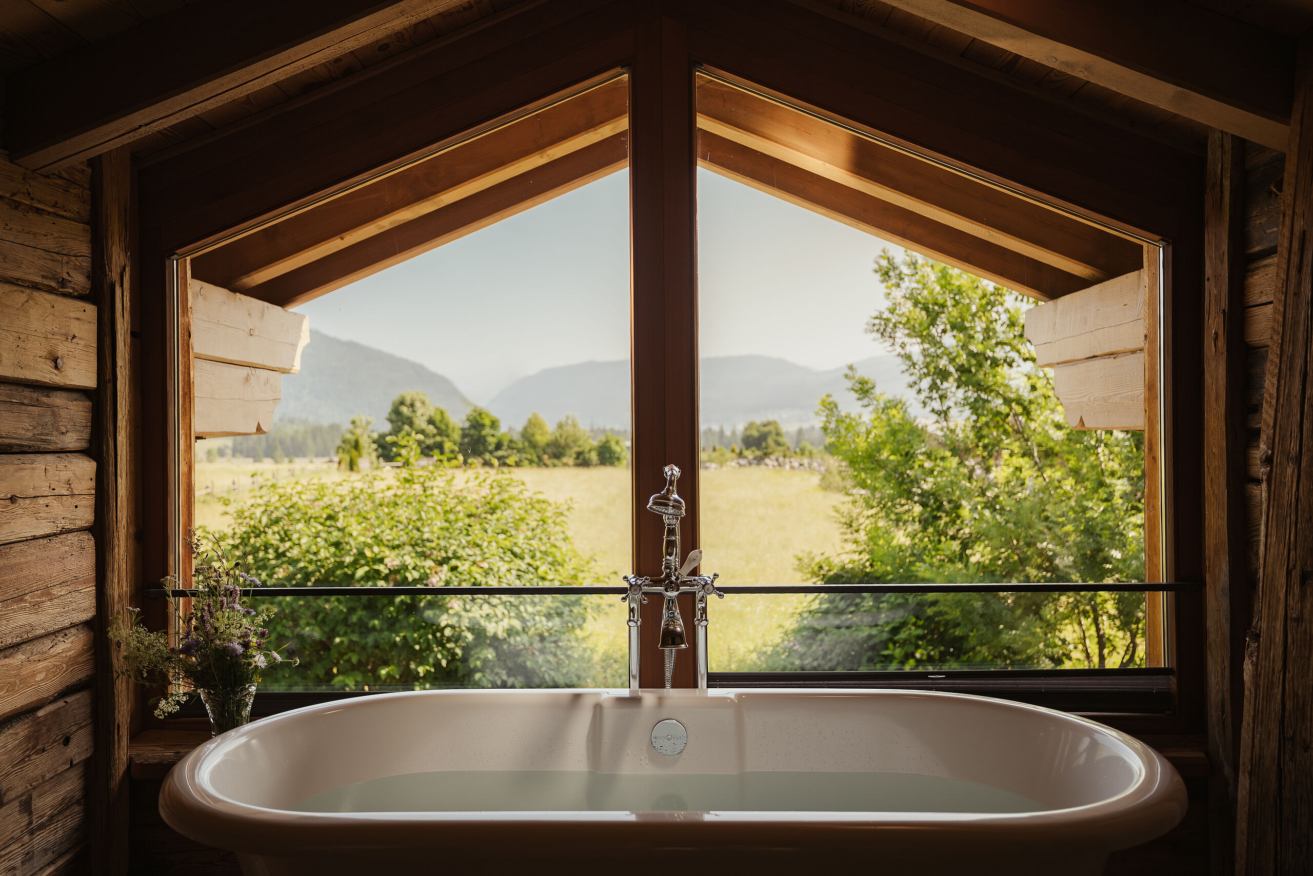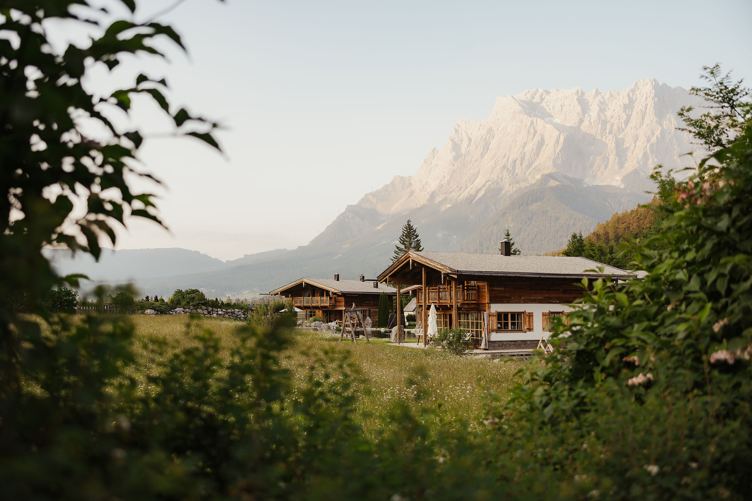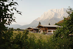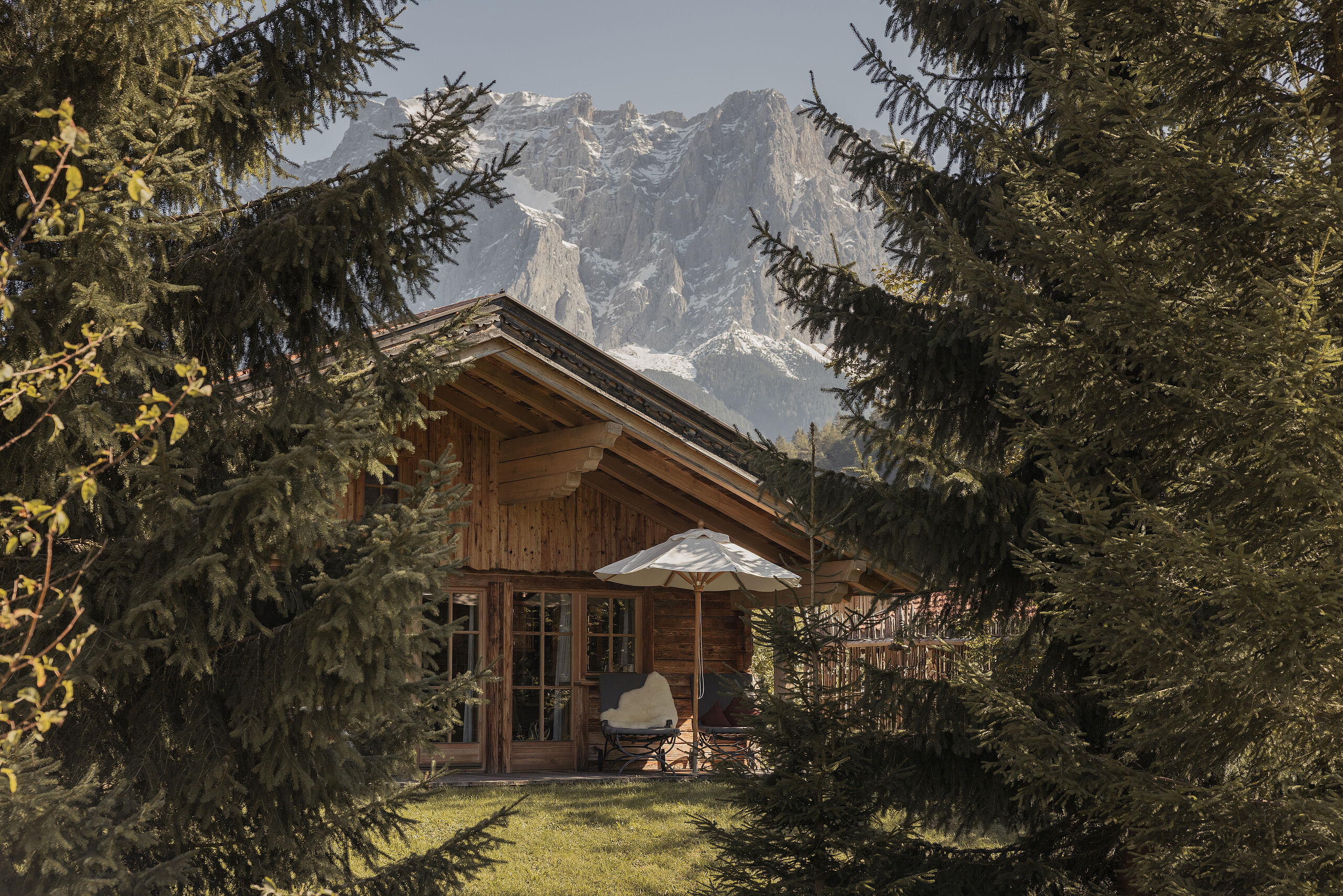 Die letzten Sonnenstrahlen fallen durch die große Fensterfront Ihres Wellnesszimmers und bieten einen klaren Blick auf die Zugspitze und das umliegende Bergpanorama. Außerdem steht Ihnen ein großzügiger privater Garten zur Verfügung, ideal zum Sonnenbaden oder Erholen.