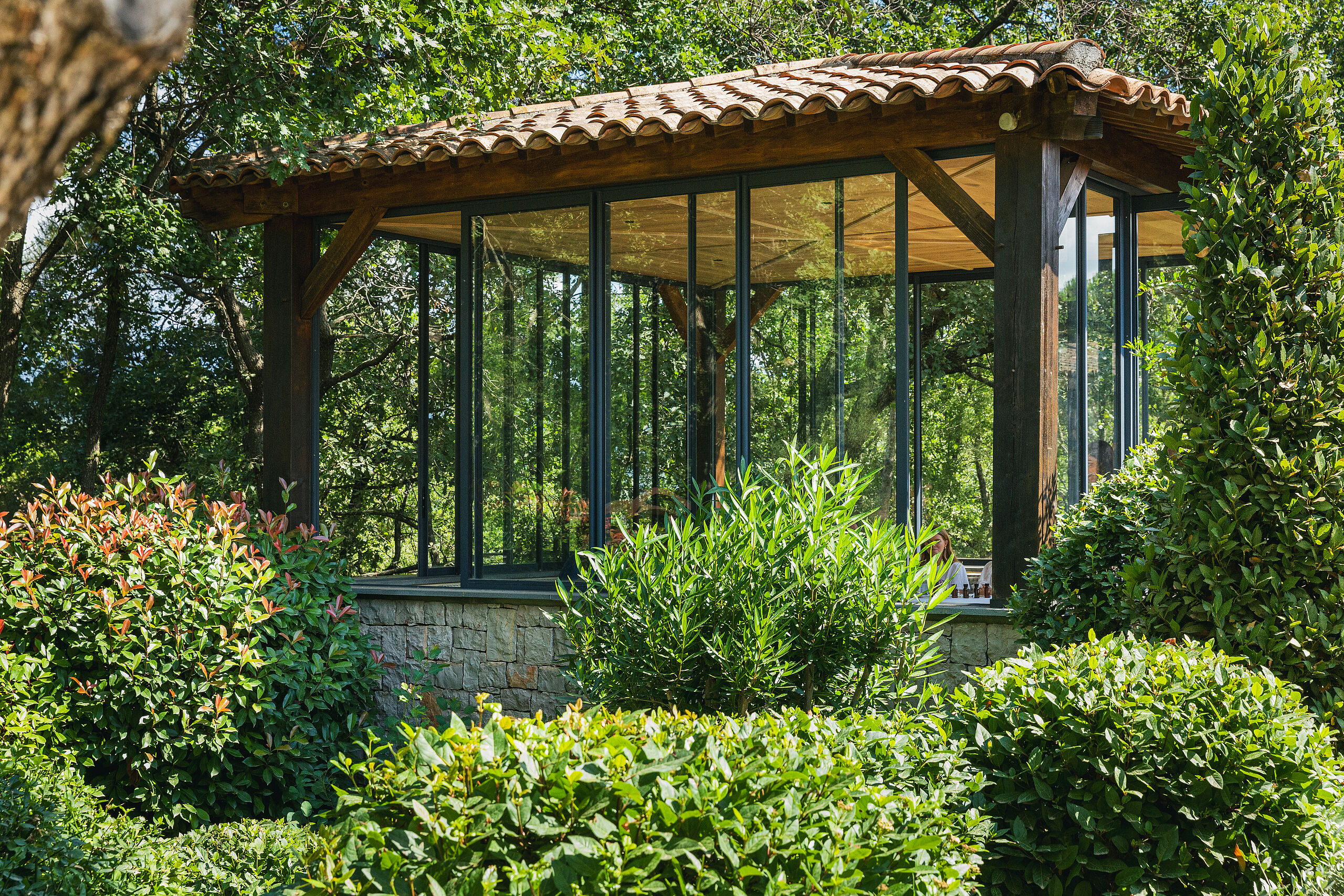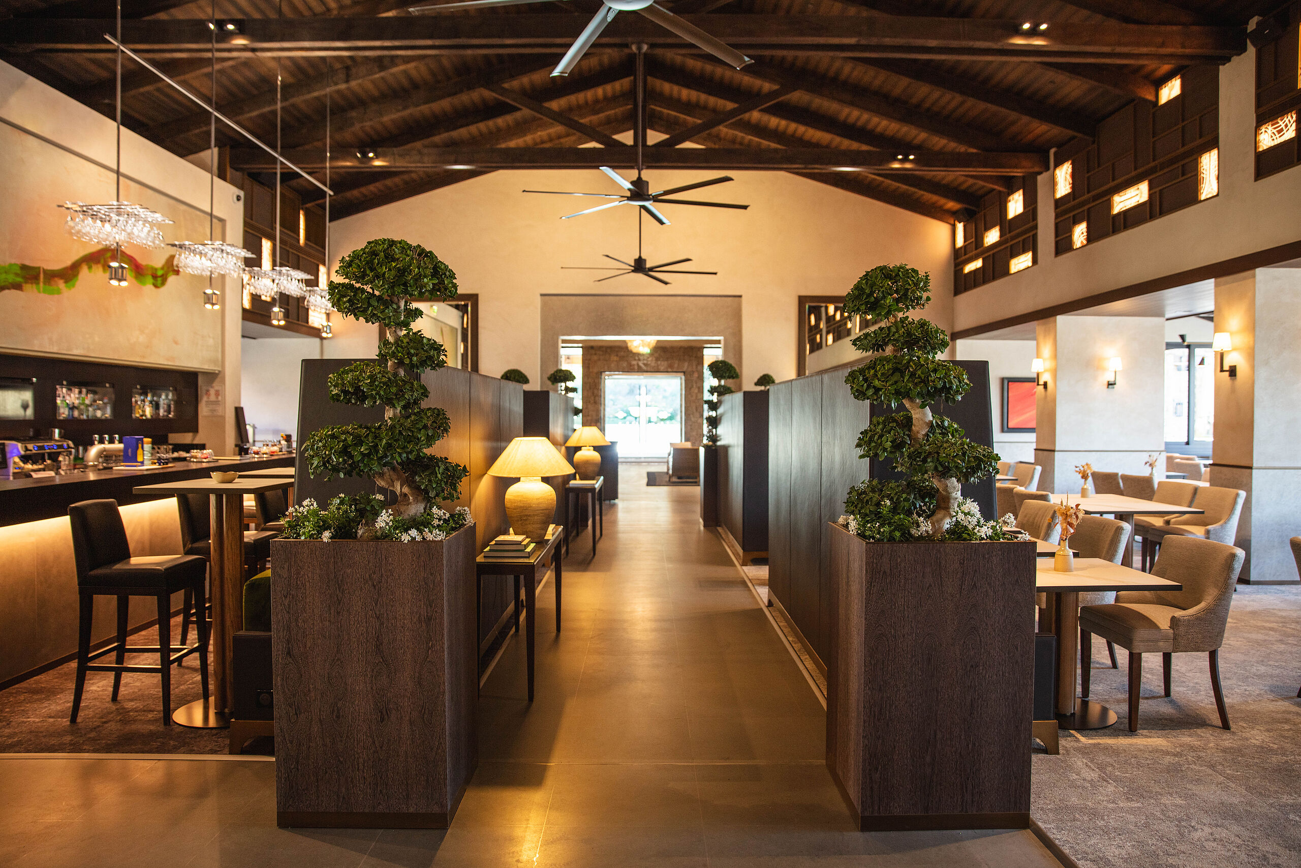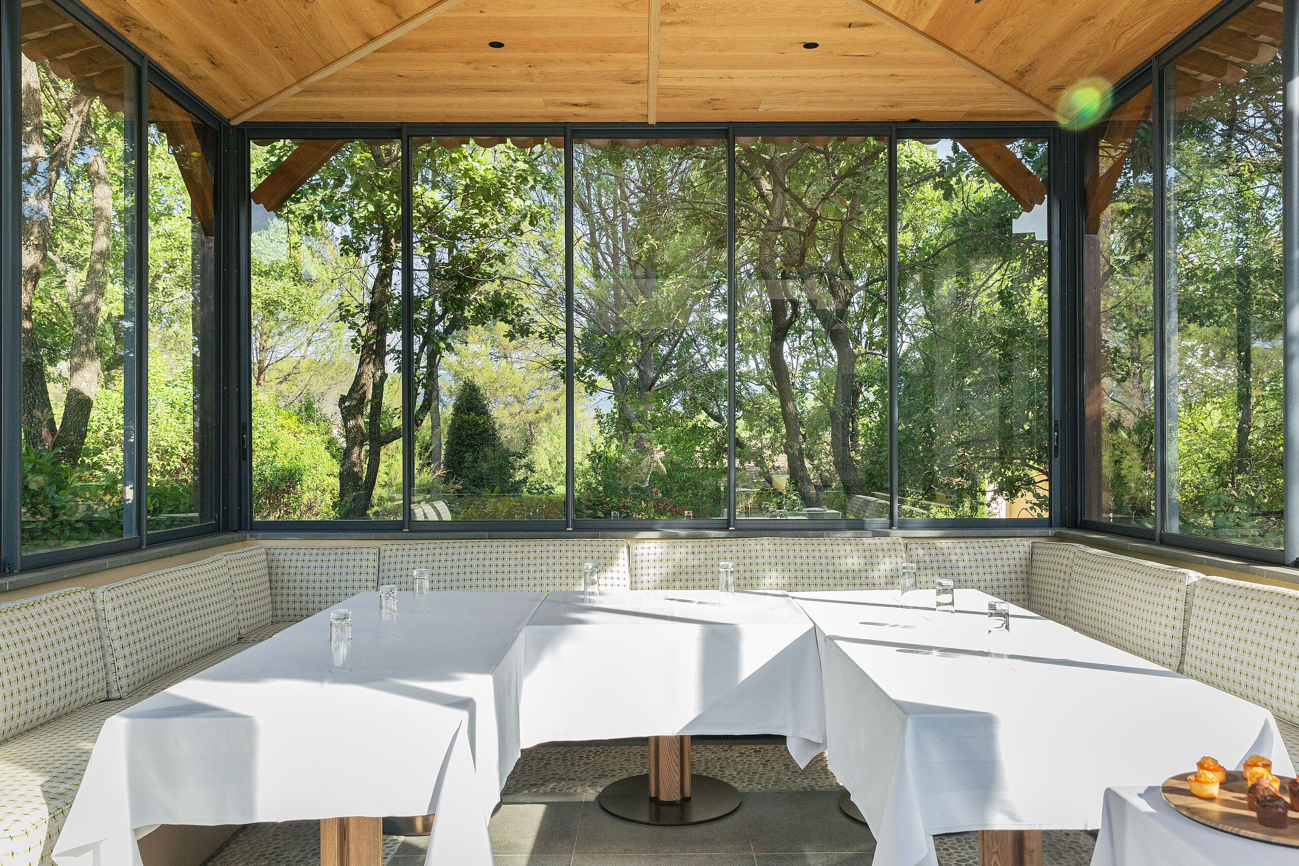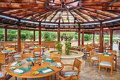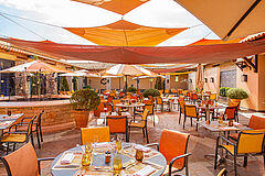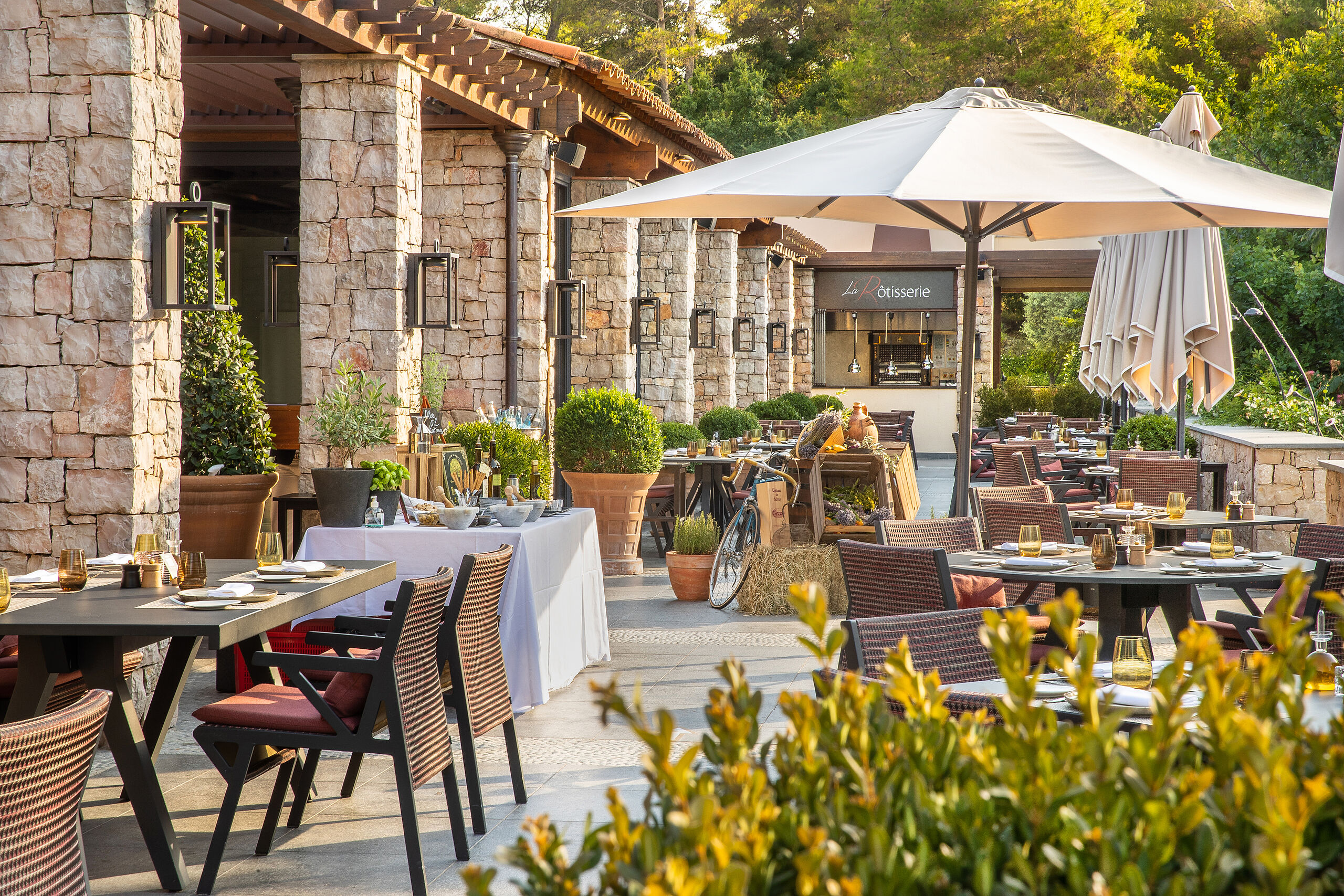 Im Clubhaus bietet Les Caroubiers Gourmetgenuss in sportlich-elegantem Ambiente mit Panoramablick auf das 18. Loch des Le Riou-Platzes. Umgeben von den Farben und den Düften des Südens erlebt man hier die Lebensart der Provence.