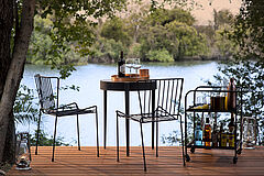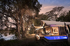 Die Thorntree River Lodge der African Bush Camps liegt direkt am Ufer des Sambesi, umgeben von der üppigen Natur des Mosi-Oa-Tunya-Nationalparks und nur einen Steinwurf von den Victoriafällen entfernt. Schon beim Frühstück auf der Terrasse oder beim Blick aus dem privaten Pool kann man Elefanten und andere Wildtiere beobachten, die ganz selbstverständlich über das Gelände streifen – ein Erlebnis, dass das Herz höher schlagen lässt.