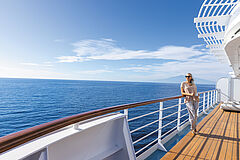 Die Veranda Suite empfängt auf etwa 28 m² mit elegantem Wohn und Schlafbereich sowie einem großzügigen Balkon, der zum Entspannen mit Blick auf den Ozean einlädt; inkludierte Annehmlichkeiten wie Champagner zur Begrüßung und 24 Stunden Kabinenservice machen jeden Moment besonders.