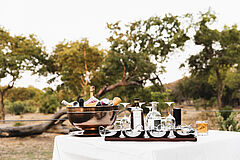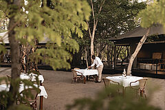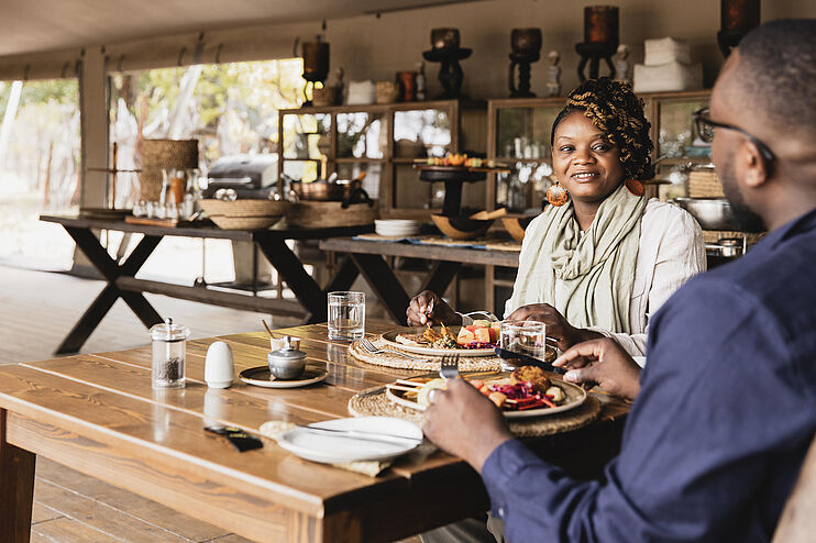 Ob ein Frühstück vor der Morgensafari, ein leichtes Mittagessen im Schatten der Bäume oder ein stilvolles Abendessen bei Kerzenschein – jedes Menü ist auf die Atmosphäre der Wildnis abgestimmt. Am Abend lassen sich die Gäste oft bei einem Dinner am Lagerfeuer nieder, während die Geräusche der afrikanischen Nacht die Stimmung begleiten.