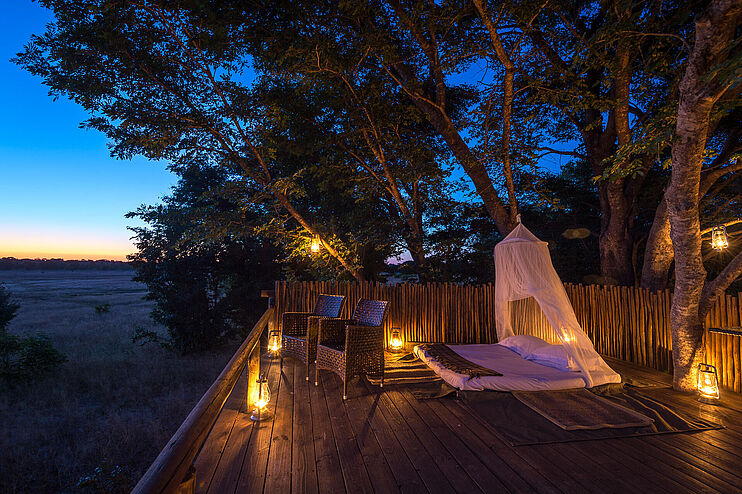 Besonders reizvoll ist die private Veranda, von der aus sich regelmäßig Elefanten, Büffel oder Antilopen am nahen Wasserloch beobachten lassen. Für ein noch intensiveres Erlebnis bietet das Camp zudem das Madison Pan Star Bed, wo Gäste unter freiem Himmel, umgeben von den Klängen der Natur, übernachten können – ein unvergessliches Safari-Abenteuer.